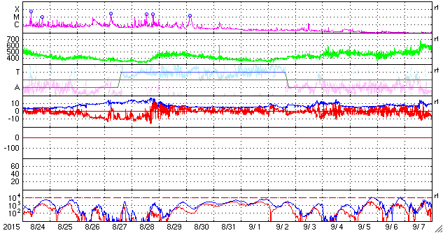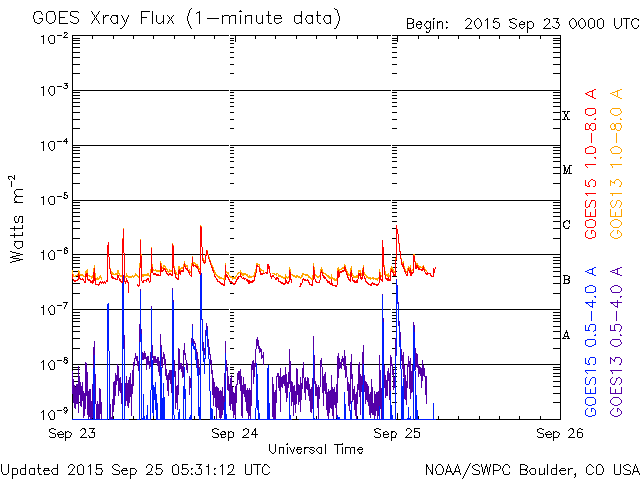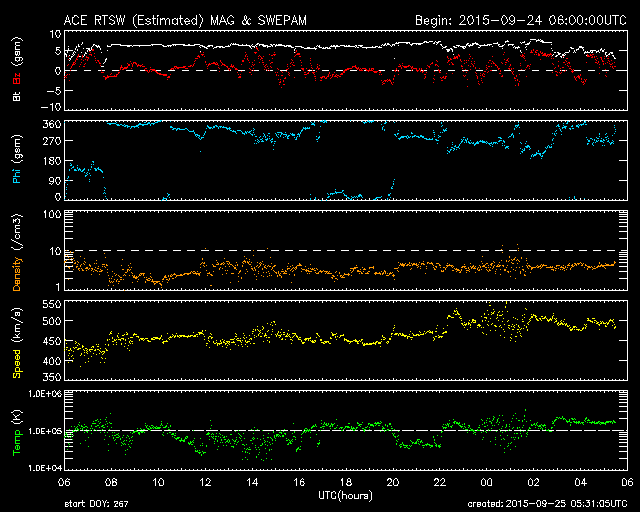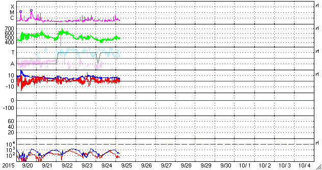 - 2015/ 9/24 14:06 太陽風はやや高まった状態が続いています。太陽でCクラスのフレアが増えています。