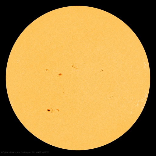 SDO衛星による太陽の可視光写真。マウスの矢印を写真に重ねると、黒点番号付きの写真に切り替わります。