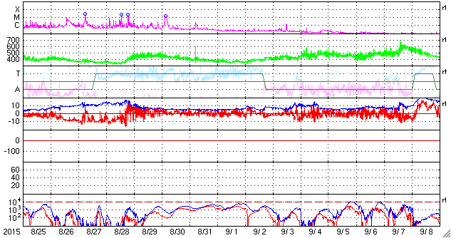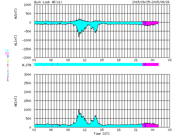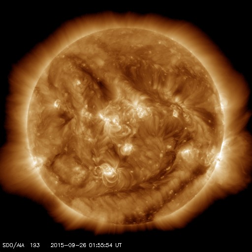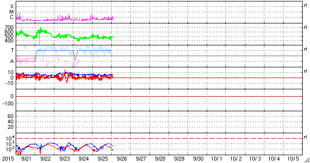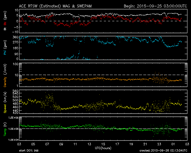 2015/ 9/26 11:12 更新 太陽風はやや高速です。カナダ・ドーソンシティのオーロラをどうぞ。 担当 篠原 23日にオーロラの写真を紹介した小貝哲夫さんより、 カナダ・ユーコン準州のドーソンシティで、 現地25日3時(世界時25日11時)と半日前に撮影されたばかりの オーロラの写真をいただきました。 今日のAE指数の図の最初の山に対応する現象です。 太陽風の速度は460km/秒。 磁場の南北成分が -3nTと南向きに振れていたため、 オーロラの活動に繋がったようです。 現地で実際に見上げている様な気持ちになれる写真です。 AE指数のグラフでは、この時間までずっと静かだった様で、 未明まで待って、ついに捉えたオーロラだったのかもしれません。 速報をありがとうございます。 太陽風は、500km/秒から460km/秒へ少し下がりましたが、 やや高速の状態が続いています。 磁場強度は、6nT前後と平均的な値です。 27日周期の図の前周期と同様に、 やや高まった太陽風になっているのかもしれません。 太陽風磁場の南北成分は、 0nT付近か、北寄りの時間が長くなっています。 その中で、-3nTくらいと振れ幅は小さいですが、 南に向いた時間が5時間ほどあり、 そこで掲載したオーロラの活動が発生しています。 AE指数では、800nTと600nTと中規模の変化が2回観測されています。 SDO衛星AIA193の太陽コロナ写真では、 コロナホールは特に見られず、 太陽風はこれから穏やかになっていきそうです。 太陽では、2424、2425、2526黒点群が出現して、 にぎやかになっています。 フレアは、2422黒点群でC1の小さいフレアが2回起きた程度で、 全体としては穏やかです。 ![]() カナダ・ユーコンのドーソンシティで、現地25日3時(世界時25日11時)に撮影されたオーロラ。 (c) 小貝哲夫氏 ![]() カナダ・ユーコンのドーソンシティで、現地25日3時(世界時25日11時)に撮影されたオーロラ。 (c) 小貝哲夫氏 ![]() カナダ・ユーコンのドーソンシティで、現地25日3時(世界時25日11時)に撮影されたオーロラ。 (c) 小貝哲夫氏 ![]() SDO衛星のAIA193カメラによる太陽コロナの様子 (c) SDO (NASA) ![]() SDO衛星による太陽の可視光写真。マウスの矢印を写真に重ねると、黒点番号付きの写真に切り替わります。 (c) SDO (NASA) ![]() ACEが観測した太陽風の磁場(1番上の枠、白線は全体の強度、赤線は南北成分) および、太陽風の密度(3番目の橙線)、速度(4番目の黄線) (c) NOAA/SWPC ![]() リアルタイムAE指数 下段のAEグラフの値が高くなると、オーロラ活動が活発化しています。 (c) 京都大学, NICT ![]() 27日の太陽周期に合わせたデータプロット 太陽が同じ面を地球に向けていた27日前の変化から、今後を予想することができます。 (c) 作図:宇宙天気ニュース