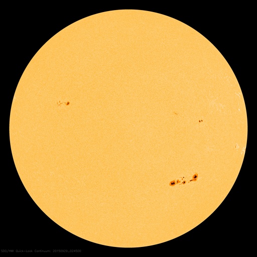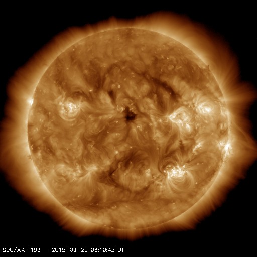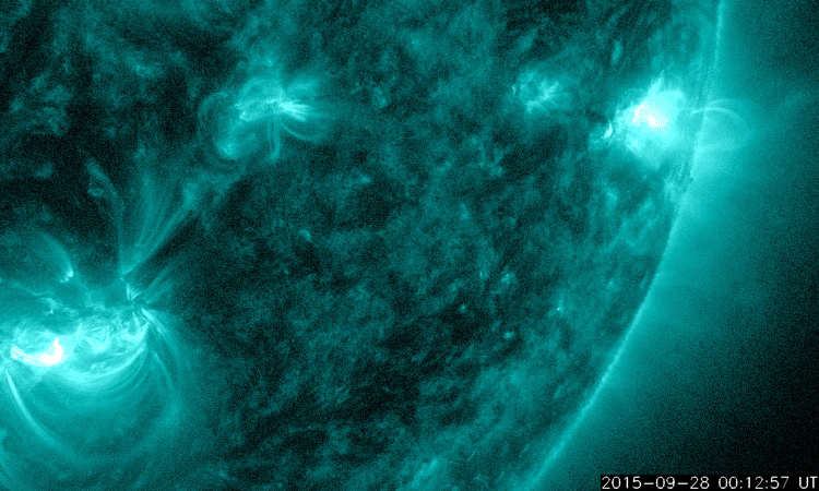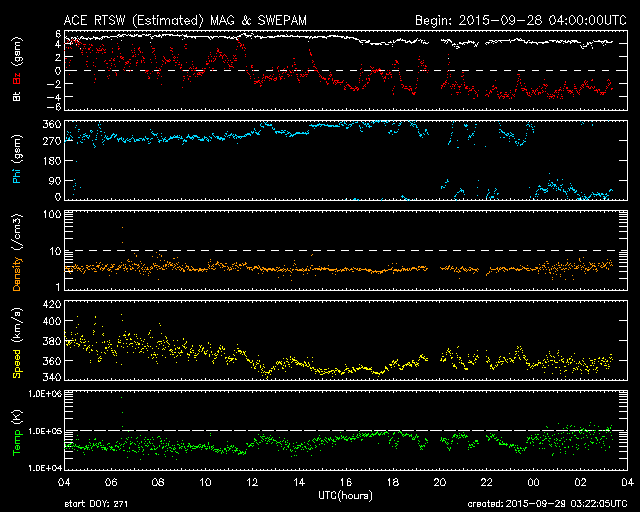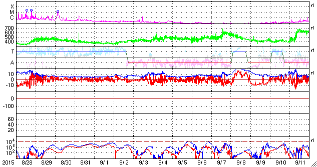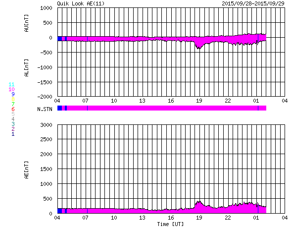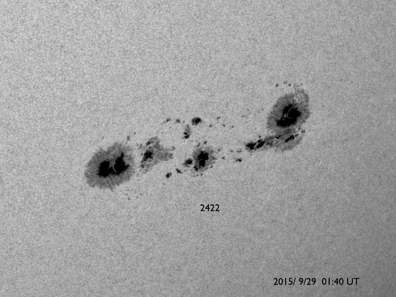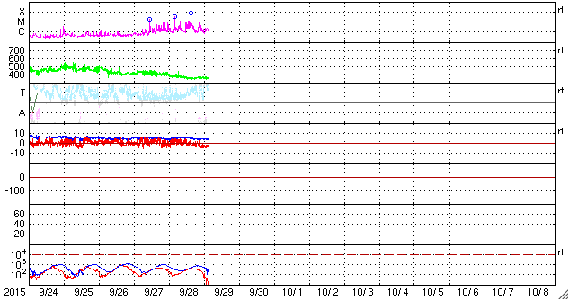 2015/ 9/29 12:21 更新 2422黒点群と2423黒点群でMクラスのフレアが4回発生しました。 担当 篠原 2422黒点群と2423黒点群の活動は更に強まり、 Mクラスの中規模フレアが4回発生しています。 初めに、西の端(右端)近くの2423黒点群で、 28日13時(世界時28日4時)にM3.6のフレアが発生しました。 続いて、南西部(右下)の2422黒点群で、 28日16時半(世界時28日7時半)にM1.1、 28日22時(世界時28日13時)にM1.1と発生して、 29日0時(世界時28日15時)には、 M7.6に達するフレアが発生しました。 M7に達するフレアの発生は、 6月25日のM7.9以来、3か月ぶりです。 この時は、CMEの噴出があり、太陽風の乱れも到来したのですが、 今回のM7.6のフレアでは、CMEの噴出は特に起きていないようです。 そして、記事を書いている最中の、 29日12時(世界時29日3時)に、 2423群でちょうどM1に達する規模のフレアが起きた様です。 Mクラスに達していれば、昨日のニュース以降5個めです。 2422、2423黒点群のフレアの様子を、 SDO衛星AIA131の動画で紹介します。 また、2422群の拡大写真を掲載します。 昨日以降も変化が続いています。 2423黒点群は西に没しかけています。 今後、フレアの発生が見えるのは、2422群だけになります。 太陽風は、速度が360km/秒へ下がり、 より低速の風になっています。 磁場強度は4nTと、少しだけですがこちらも下がっています。 磁場の南北成分は、グラフの中盤以降南寄りに推移してます。 -3nT程度と振れ幅は小さく、速度も低速になっているので、 磁気圏への影響は小さく、 AE指数は300nTくらいの高まりが起きている程度です。