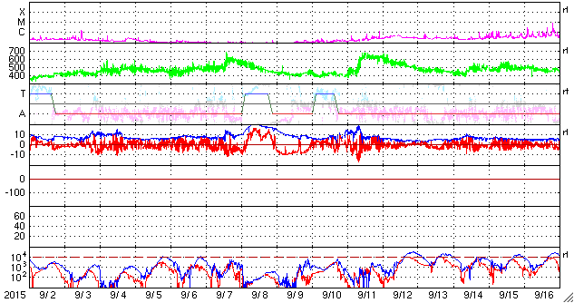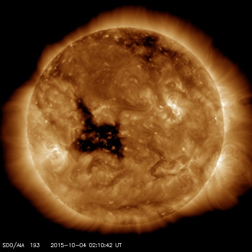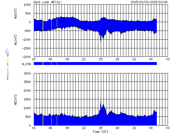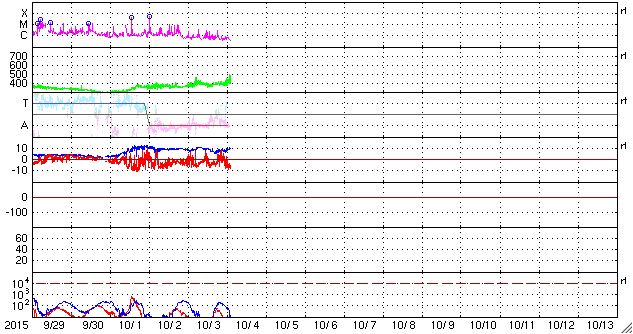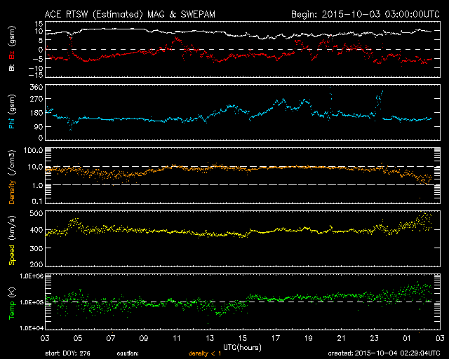 2015/10/ 4 11:30 更新 太陽風磁場の強まりは続いています。2422黒点群は西に没しました。 担当 篠原 太陽風磁場の強まりは、現在も続いています。 昨日以降も、7〜10nTの間をゆっくりと変化する状態が続いています。 速度は、400km/秒近くで安定しています。 先ほどから450km/秒に高まる変化が見えていますが、 大きく上がることはないでしょう。 磁場の南北成分は、南寄りの傾向が続き、 -5nTくらいの変化も頻繁に発生しています。 AE指数のグラフは、太くなった状態が続いていますが、 時々、300〜500nT程度の変動が発生していることから、 磁気圏もある程度活動的な状態が続いている様です。 SDO衛星AIA193の太陽写真では、 中央の東寄り(左寄り)に広がっているコロナホールの先頭(右端)が、 太陽の中心線に達しています。 コロナホールは、太陽の磁場が宇宙空間に向かって広がっている領域で、 速度の高い太陽風の吹き出し口になっています。 コロナホールの端が太陽の中心に達したため、 高速の太陽風は地球に向かって吹き出す様になります。 地球まで3日くらいかかると考えると、7日頃から太陽風が強まりそうです。 太陽風の磁場が強まって、南向きに大きく変化すると、 磁気圏の活動も活発になります。 コロナホールは27日前の前周期よりも大きく広がっています。 今週の後半にかけて、太陽風の変化に注目して下さい。 太陽では、活発にフレアを起こしていた2422黒点群が、 西の端(右端)の向こう側に回って、見えなくなりました。 X線のグラフは、変化がなくなるとともに、 全体の強度も下がっています。 可視光写真も、2427黒点群があるだけで、 やや寂しくなっています。