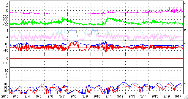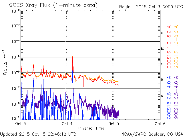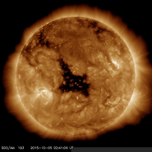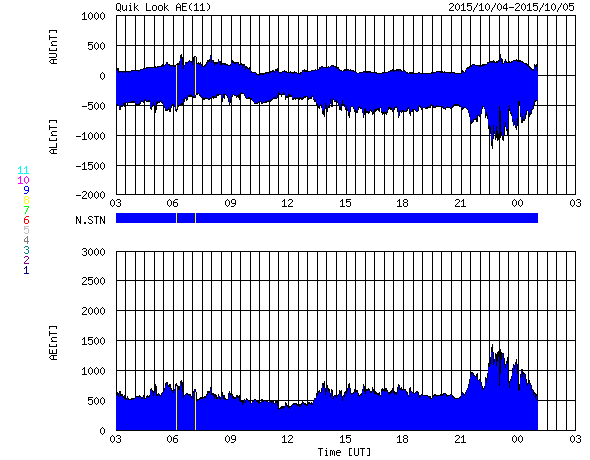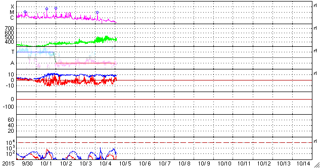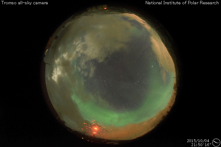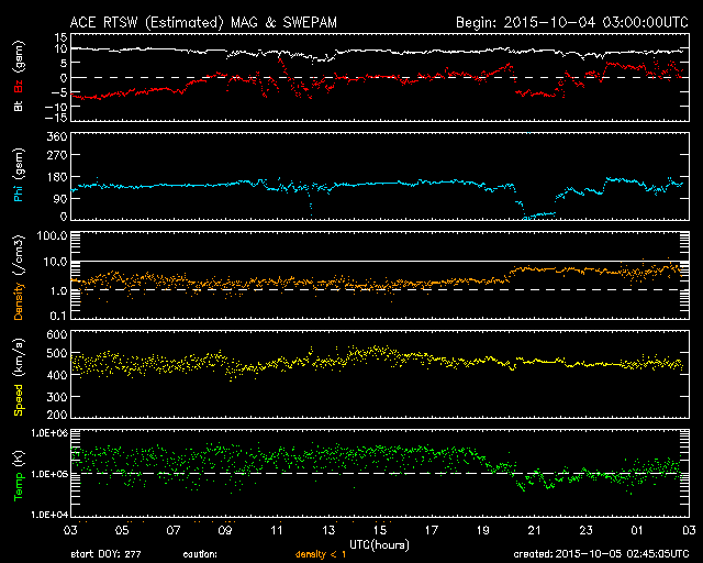2015/10/ 5 11:46 更新 太陽風はやや強まった状態です。太陽は穏やかになっています。 担当 篠原 太陽風の磁場強度は、8〜10nTに強まった状態が続いています。 昨日のニュースの頃に450km/秒に高まった速度も、 その状態で安定しています。 10月1日に始まった太陽風の弱い高まりは、 5日目に入っています。 SDO衛星AIA193の太陽写真では、 中心部にコロナホールが大きく広がっていて、 ここから流れ出している高速太陽風の変化に、 このまま繋がっていくかもしれません。 太陽風磁場の南北成分は、 南向きに振れたり、0nT付近で小さい変化したりと、 傾向が時々変化しています。 AE指数のグラフは、太くなった状態が続いていて、 読み取りにくいのですが、 小さい変化が続いたり、変化の値が大きくなったりと、 活動的な状態が続いているようです。 世界時4日22〜23時頃に目立った変化が起きていますが、 この時のオーロラの様子を、 10月から観測が再開されたノルウェー・トロムソの 全天カメラの動画で紹介します。 今日の写真は雲が多くて残念ですが、 昭和基地からトロムソへ、季節の移り変わりを感じます。 太陽では、西に没した2422黒点群で、 4日11時半(世界時4日2時半)に、 M1.0の中規模フレアが発生しました。 太陽の向こう側に見えなくなった直後の、 去り際のフレアです。 現在見えている黒点は、2427群だけの様です。 X線グラフの変化もなくなり、太陽は穏やかになっています。