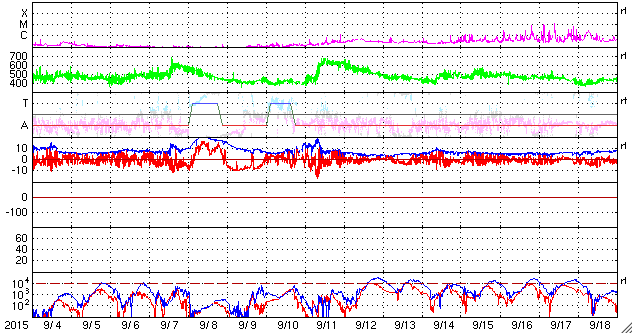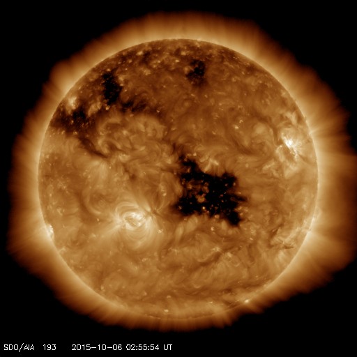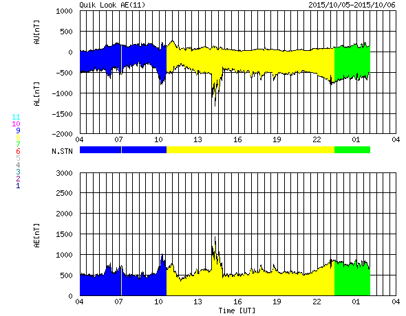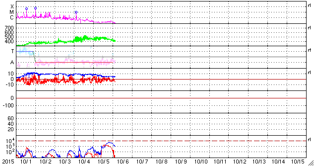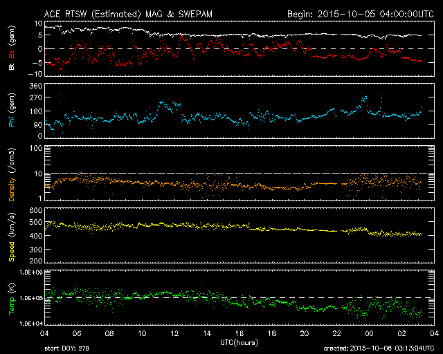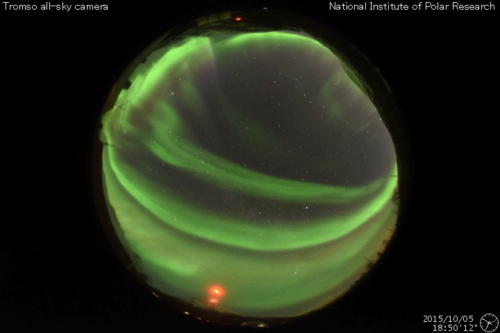 2015/10/ 6 12:12 更新 太陽風は平均的な状態に戻っています。太陽は穏やかです。 担当 篠原 10nT近くに強まっていた太陽風の磁場強度は、 昨夜にかけて5nTへ下がり、平均的な強さに戻っています。 速度も、450km/秒から400km/秒へ下がり、平均的な状態です。 10月1日に始まった太陽風の高まりは、一段落付いた様です。 太陽風磁場の南北成分は、南寄りの傾向が続いていて、 磁気圏の活動も高まっている様です。 AE指数のグラフは、 全体的に太くなる状態が続いている様ですが、 その中で、増減の変化が起きています。 昨日に続いて、ノルウェーのトロムソで撮影された、 6日4〜5時(世界時5日19〜20時)頃のオーロラを紹介します。 激しい輝きが何度も空を覆っています。 SDO衛星AIA193の太陽コロナ写真では、 中央部のコロナホールが西へ進み、 地球へ影響を及ぼし始める目安の位置に近づいています。 明日くらいから、太陽風の磁場や速度に変化が現れそうです。 太陽は、西側に2427黒点群が見えるだけで、 X線のグラフには特に変化はなく、穏やかです。 ![]() ノルウェー・トロムソの全天カメラにより撮影された、世界時5日19〜20時頃のオーロラ。 (c) 国立極地研究所、(動画加工 : 宇宙天気ニュース) ![]() SDO衛星のAIA193カメラによる太陽コロナの様子 (c) SDO (NASA) ![]() SDO衛星による太陽の可視光写真。マウスの矢印を写真に重ねると、黒点番号付きの写真に切り替わります。 (c) SDO (NASA) ![]() ACEが観測した太陽風の磁場(1番上の枠、白線は全体の強度、赤線は南北成分) および、太陽風の密度(3番目の橙線)、速度(4番目の黄線) (c) NOAA/SWPC ![]() リアルタイムAE指数 下段のAEグラフの値が高くなると、オーロラ活動が活発化しています。 (c) 京都大学, NICT ![]() 27日の太陽周期に合わせたデータプロット 太陽が同じ面を地球に向けていた27日前の変化から、今後を予想することができます。 (c) 作図:宇宙天気ニュース