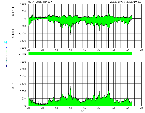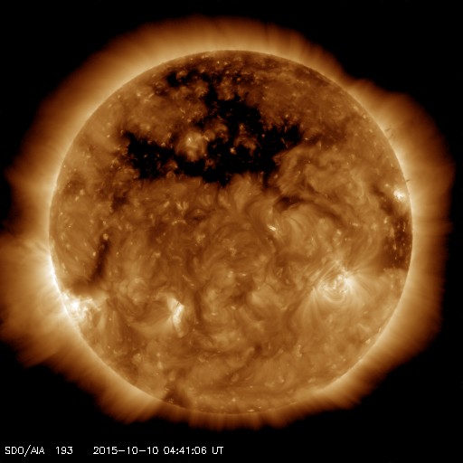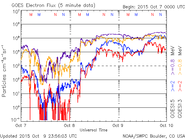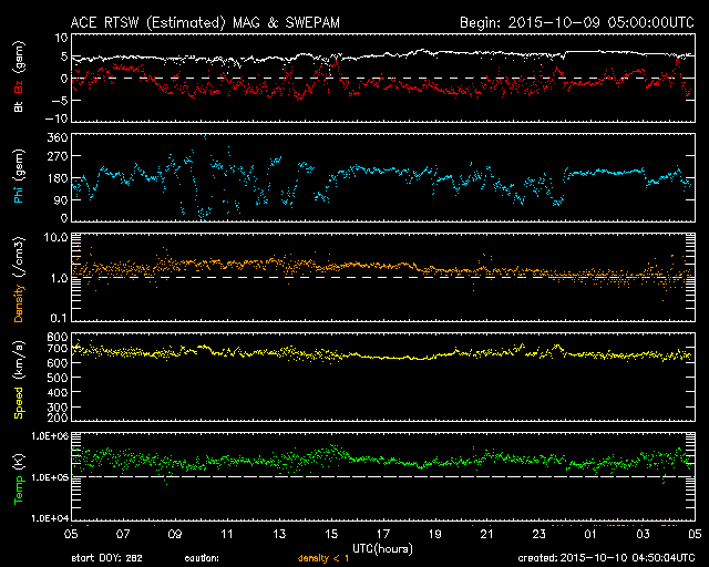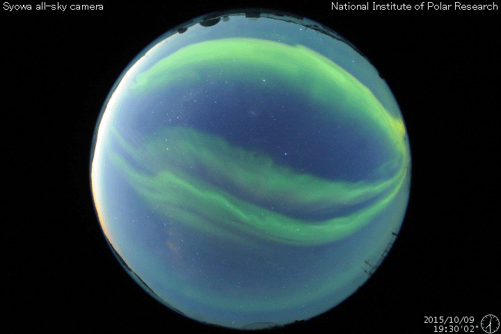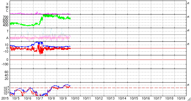2015/10/10 13:51 更新 650km/秒の高速太陽風が続いています。磁気圏の活動も活発です。 担当 篠原 高速の太陽風が続いています。 昨日のニュースの直後に700km/秒台を割って、 現在は650km/秒に下がっていますが、 依然、高い速度が続いています。 磁場強度は、5nTと平均的な値で安定しています。 磁場の南北成分は、振れ幅は小さいですが、 南寄りの傾向が続いています。 このため、磁気圏の活発な活動はその後も続いていて、 AE指数は、500nTを越える変化が続き、 1000nTに達する大きな変化も度々起きています。 南極の昭和基地では、今日も見事なオーロラの写真が撮影されています。 世界時9日19時半頃の動画を掲載します。 AE指数で、1000nTに達する変化が起きている頃のオーロラです。 オーロラの光の帯のうねる姿が見事です。 現地では素晴らしい夜になっていることでしょう。 SDO衛星AIA193の太陽コロナ写真写真では、 今回の高速太陽風をもたらした赤道付近のコロナホールは、 太陽の西の端に達しています。 そろそろこちらの影響は弱まりそうです。 一方、北半球には、大きな別のコロナホールが広がっています。 緯度がやや高いのですが、今後はこの領域の影響に変わっていくでしょう。 どの程度の太陽風の変化がやって来るでしょうか。 放射線帯の高エネルギー電子は、さらに増加しています。 青線のGOES15は、100,000を超えているほどです。 ここまで高まったのは、 第24活動周期に入って初めてかもしれません。 太陽は、南東に2430黒点群が小さく見えているだけです。 X線のグラフに変化はなく、穏やかです。