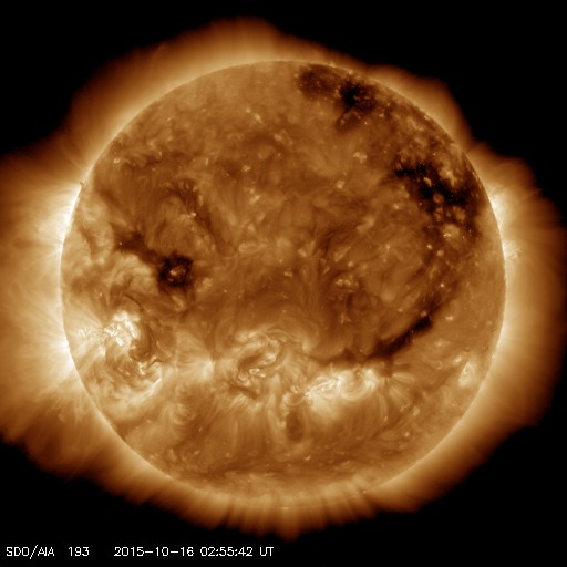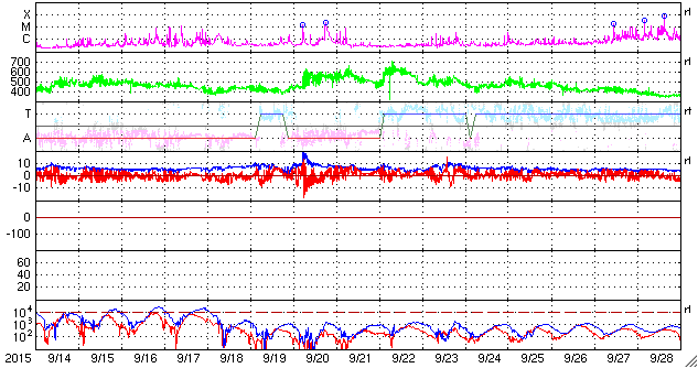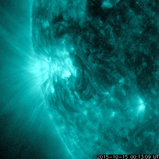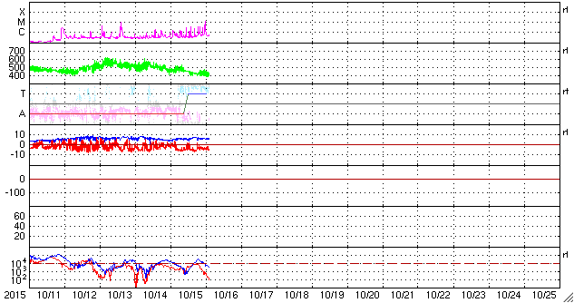2015/10/16 12:01 更新 2434黒点群でM1のフレアが発生しました。太陽風は平均的な速さに戻っています。 担当 篠原 2434黒点群の活動が、再び活発になっています。 昨日のニュース以降、C3.6、C3.9、C3.1などを最大とする Cクラスの小規模フレアが12回発生し、 今朝、16日8時半には、M1.1の中規模フレアが発生しました。 活発な活動の様子を、SDO衛星AIA131の動画で紹介します。 GOES衛星のX線グラフでは、M1.1フレアに重なる様に、 C4.9の小規模フレアも発生しています。 これは、東端(左端)の向こうの北半球側で起きたフレアです。 ここにも活動的な領域がある様です。 太陽風は、速度が450km/秒から400km/病へ下がり、 平均的な速さに戻っています。 コロナホールの広がりはありましたが、 強い影響は及ばなかった様です。 太陽風の磁場強度は、6nTと平均的な値で安定しています。 磁場の南北成分は、-5nT前後で南側に振れ続けています。 AE指数は、300nTの小規模の変化が連続的に発生していますが、 あまり大きな変化にはなっていません。 放射線隊の高エネルギー電子は、 今日も10,000のレベルに達しています。 太陽風が落ち着いてきたので、 これからゆっくりと減少に向かいそうです。 ![]() 2434黒点群のフレア活動の様子。SDO衛星AIA131。 (c) SDO (NASA)、 (動画加工 : 宇宙天気ニュース) ![]() SDO衛星のAIA193カメラによる太陽コロナの様子 (c) SDO (NASA) ![]() SDO衛星による太陽の可視光写真。マウスの矢印を写真に重ねると、黒点番号付きの写真に切り替わります。 (c) SDO (NASA) ![]() GOES衛星の太陽X線データ (c) NOAA/SWPC ![]() ACEが観測した太陽風の磁場(1番上の枠、白線は全体の強度、赤線は南北成分) および、太陽風の密度(3番目の橙線)、速度(4番目の黄線) (c) NOAA/SWPC ![]() リアルタイムAE指数 下段のAEグラフの値が高くなると、オーロラ活動が活発化しています。 (c) 京都大学, NICT ![]() 27日の太陽周期に合わせたデータプロット 太陽が同じ面を地球に向けていた27日前の変化から、今後を予想することができます。 (c) 作図:宇宙天気ニュース