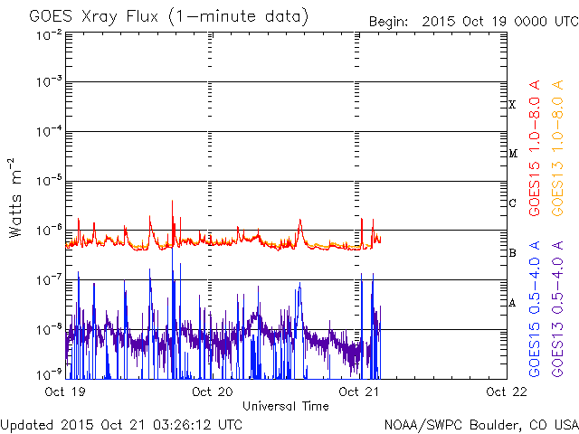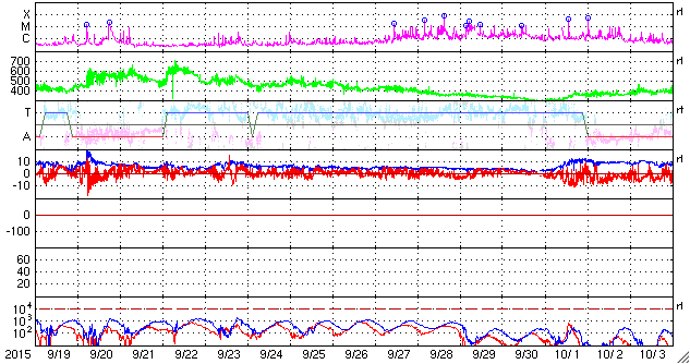 - 2015/10/18 12:32 太陽の東端でMフレアが2回発生しました。太陽風はやや低速です。