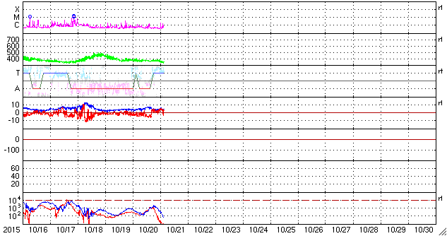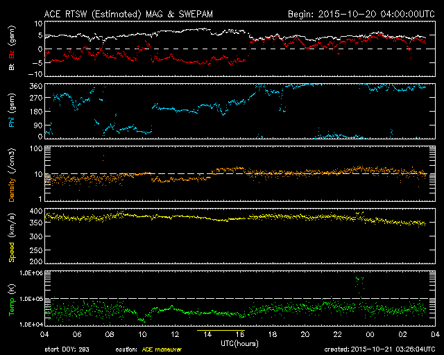 - 2015/10/20 11:42 太陽風はやや低速で、磁気圏も穏やかです。