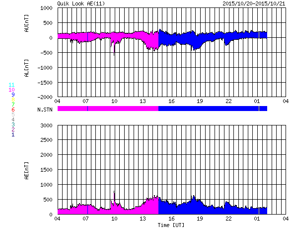 下段のAEグラフの値が高くなると、オーロラ活動が活発化しています。