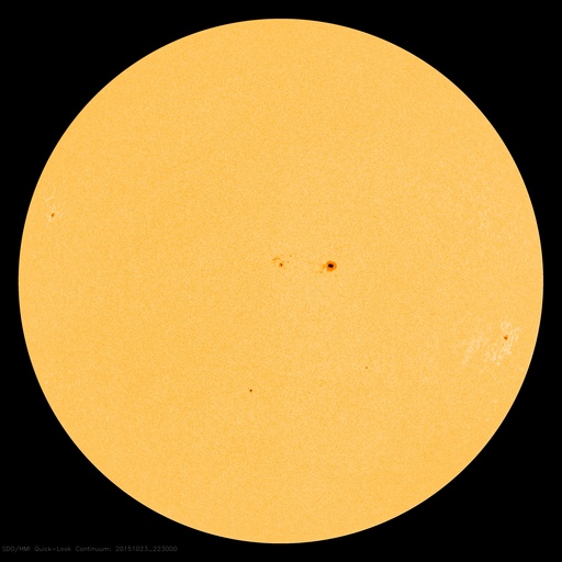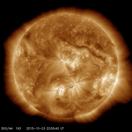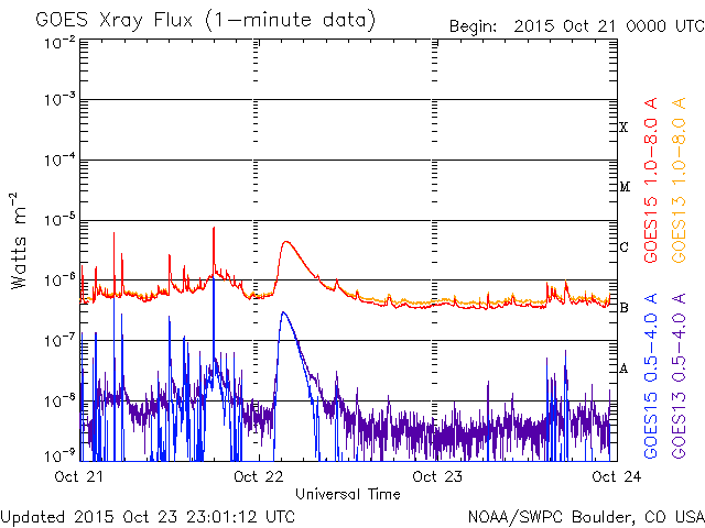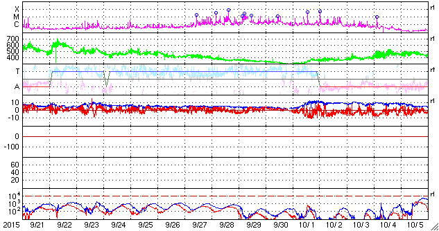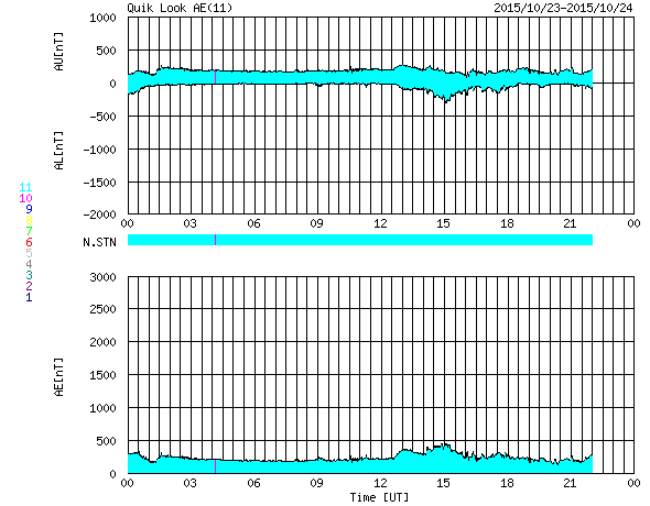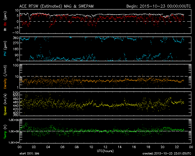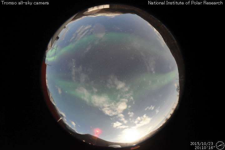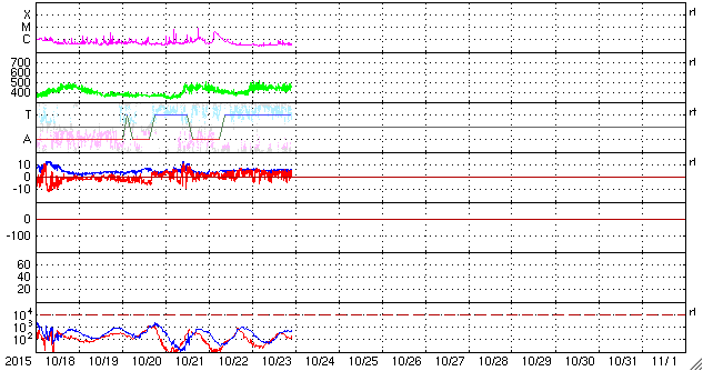 2015/10/24 08:01 更新 太陽風はやや高速で安定しています。太陽は穏やかです。 担当 篠原 太陽風は、450km/秒とやや高速の状態が続いています。 磁場強度は、6nTと平均的な状態で安定しています。 磁場の南北成分は、北寄りに推移しています。 このため、AE指数は全体的に穏やかなのですが、 グラフの後半に、弱い変化が見えている様です。 世界時23日20〜22時のノルウェー・トロムソのオーロラの様子を、 全天カメラの動画で紹介します。 この様な活動が極域で見られていたようです。 太陽は、目立ったフレアの発生はなく、穏やかです。 GOES衛星のX線グラフは、小さい変化しか起きていません。 鹿児島高専では、今日から高専祭として、 土曜日は文化祭、日曜日は体育祭が行われます。 2日とも好天に恵まれそうで、楽しいお祭りになりそうです。