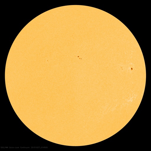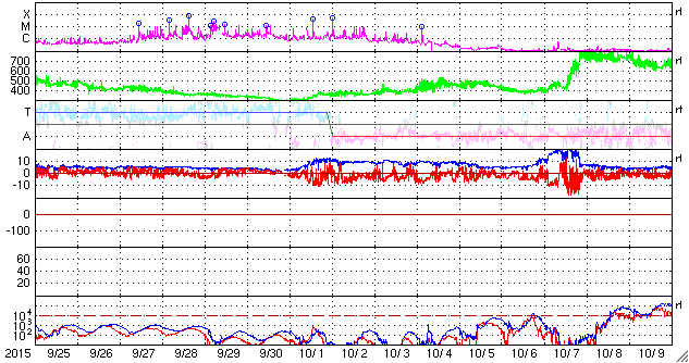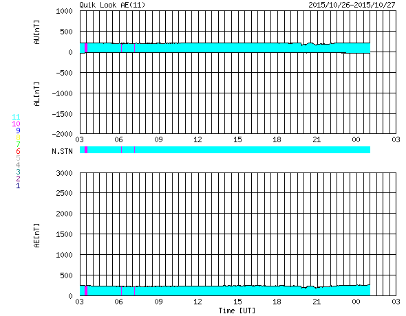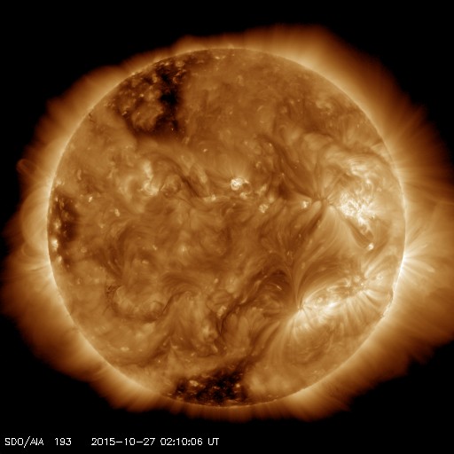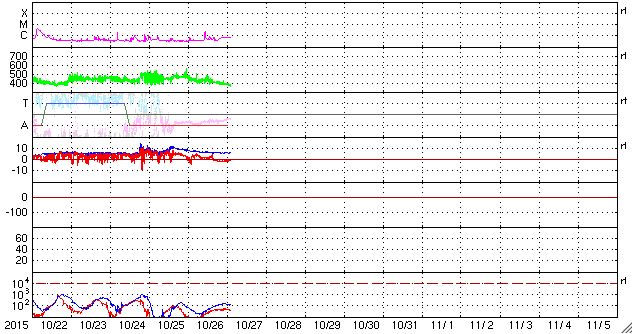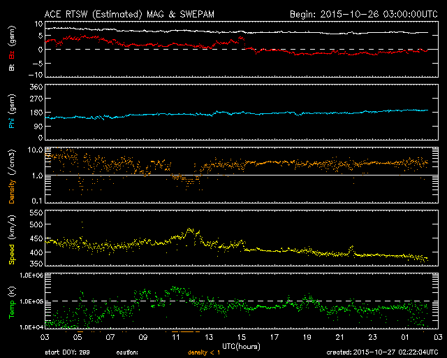 2015/10/27 11:23 更新 太陽風は低速に変わりつつあります。太陽は穏やかです。 担当 篠原 太陽風の速度は、380km/秒へ下がり、 低速の風に変わりつつあります。 磁場強度も、7nTから6nTへ少し下がっています。 27日周期の図を見ると、前周期の9月30日の太陽風は、 速度も遅く、磁場強度も弱くなっています。 そして、翌、10月1日から、 磁場強度が10nTに強まる変化が始まっています。 速度の高まりは小幅でしたが、磁場が南向きに振れて、 磁気圏の活動が高まりました。 今回も、太陽風は弱まりかけていますが、 この後、前周期の様に磁場の強まりが到来するかもしれません。 明日、明後日にかけて、注目して下さい。 現在の磁気圏は穏やかで、AE指数は目立った変化はありません。 太陽では、南西の2437黒点群でC2.1の小規模フレアが発生した程度で、 全体としては穏やかです。 昨日中央部に現れた黒点に、2440群と番号が付けられています。 SDO衛星AIA193の太陽コロナ写真の東端(左端)の赤道付近に、 コロナホールが姿を現しています。 この領域は、前周期の10月4日に太陽の中心線に達し、 10月7日に始まった高速太陽風の発生源となりました。 今回も同様の推移をすると考えると、 コロナホールは、31日頃に太陽の中心線に達し、 高速の太陽風は、11月3日くらいから始まりそうです。 一週間ほど先のことですが、今後の推移に注目して下さい。 ![]() SDO衛星のAIA193カメラによる太陽コロナの様子 (c) SDO (NASA) ![]() SDO衛星による太陽の可視光写真。マウスの矢印を写真に重ねると、黒点番号付きの写真に切り替わります。 (c) SDO (NASA) ![]() ACEが観測した太陽風の磁場(1番上の枠、白線は全体の強度、赤線は南北成分) および、太陽風の密度(3番目の橙線)、速度(4番目の黄線) (c) NOAA/SWPC ![]() リアルタイムAE指数 下段のAEグラフの値が高くなると、オーロラ活動が活発化しています。 (c) 京都大学, NICT ![]() 27日の太陽周期に合わせたデータプロット 太陽が同じ面を地球に向けていた27日前の変化から、今後を予想することができます。 (c) 作図:宇宙天気ニュース