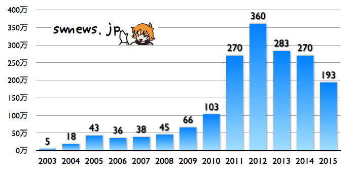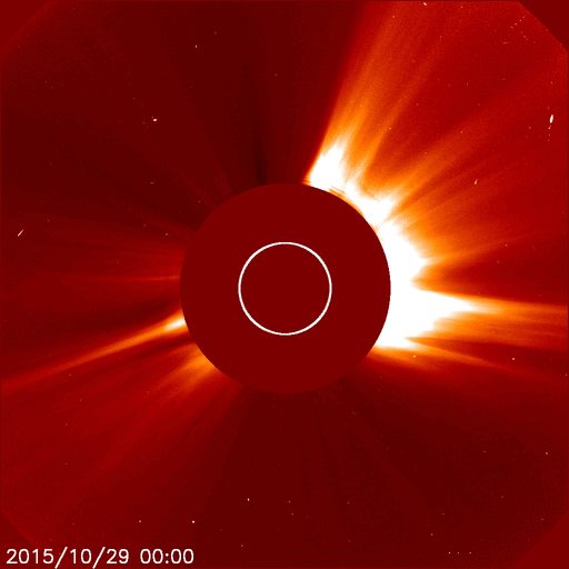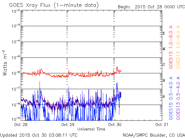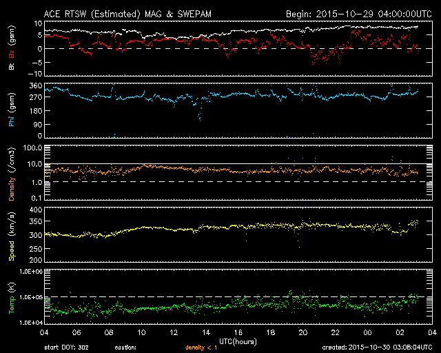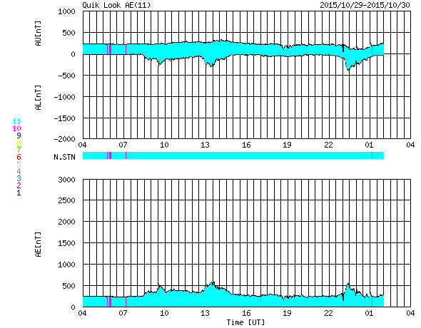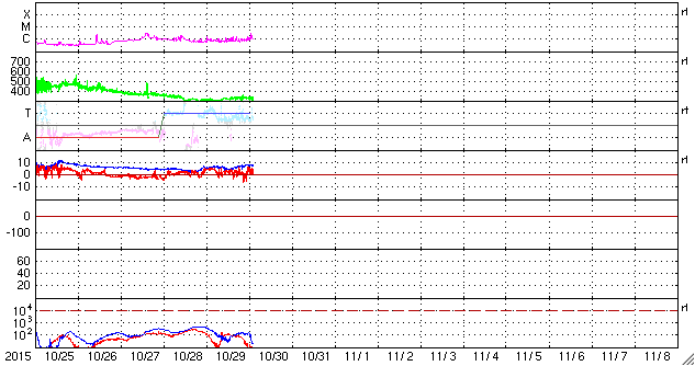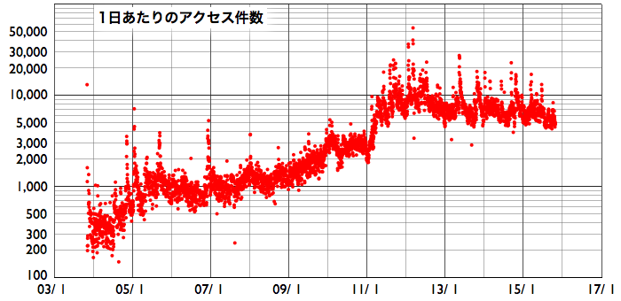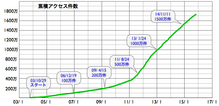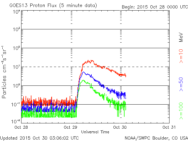 2015/10/30 12:08 更新 太陽放射線が高まりました。現在の宇宙天気ニュースのアクセス状況を報告します。 担当 篠原 昨日、10月29日は、宇宙天気ニュースの12歳の誕生日でした。 通常なら、およそ11年と言われる太陽の活動周期をとっくに超えているのですが、 第23期から第24期にかけて発生した長い極小期のため、 12年経った現在でも、太陽活動を一周したのかどうかよく分からない印象です。 久しぶりとなりますが、これまでのアクセス状況について紹介します。 ここで数えているのは、最新記事のページへのアクセス数のみです。 過去記事やオーロラ写真など、その他のページへも、 これと同じくらいのアクセス数があります。 1枚目の図は、1日あたりのアクセス数の推移です。 縦軸を対数のグラフにしているので、慣れていないと読みにくいかもしれません。 2015年を見ると、1日あたり 5,000 〜 7,000 件で推移しています。 昨日までの2015年の平均値は、1日あたり 6,388 件です。 太陽活動が極大を迎えていた2011〜2012年頃は、 1日あたり 10,000 件前後を記録していたのですが (2012年の年間平均は、1日あたり9848件でした)、 その頃と比べると、半分近くに減っています。 グラフが、時々大きく跳ね上がっていますが、 これらは、大規模な太陽活動、磁気嵐が起きた時です。 最高記録は、2012年3月8日の 54,641 件、 今年の最高記録は、2015年3月18日の 16,906 件です。 2枚目の図は、アクセス数の累計です。 開始して11年後の2014年秋に 1500万件を突破して、 昨日までに、1730万件に達しています。 3枚目は、年毎に累計を求めたグラフです。 太陽活動が高まった2011年に大きく上昇し、2012年にピークに達して、 以降は、次第に減少しています。 今年はもう2か月残っていますので、230万件くらいになりそうです。 記事の総数は、昨日までで4365回でした。 これまでお読みいただきたいへんありがとうございます。 これから2020年頃の極小に向かって、 次第に変化が少なくなる、寂しい時期を迎えますが、 どうぞこれからもよろしくお願い致します。 昨日の昼、29日12時(世界時29日3時)頃から、 太陽放射線(非常に高速の陽子の流れ)の増加が発生しています。 X線のグラフでは、この頃に目立った変化はなく、 太陽のこちら側は穏やかだったのですが、 SOHO衛星LASCO C2、C3の動画では、 太陽放射線が増加する頃に、太陽の西に向かってCMEが噴出していました。 従って、太陽の西の端の向こう側で、 ある程度の規模を持ったフレアが発生した様です。 太陽放射線のグラフは、最大で20くらいに達し、 現在は減少を続けています。 太陽は、東端の2443黒点群で、 C1〜2の小さいフレアが頻繁に発生していて、 昨日のニュース以降、10回に達しています。 フレアの規模が大きくなってくると、注意もより必要になるでしょう。 太陽風は、今日に入った頃から磁場強度が8nTに高まっています。 変化としては小幅ですが、 前周期に見られた太陽風磁場の強まりが、 いくらか残っていたのでしょうか。 太陽風の速度は、300km/秒から340km/秒へ少し上がっていますが、 低速の状態は続いています。 磁場の南北成分は、北寄りに推移していて、 磁気圏は概ね静穏です。 AE指数は、小さい変化が時々見られる程度です。