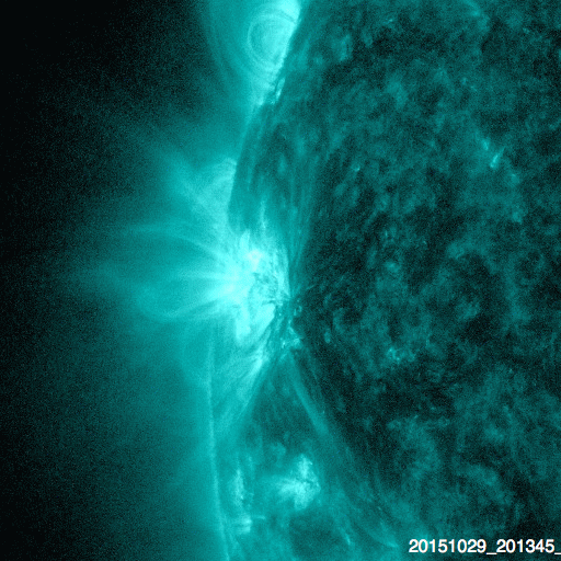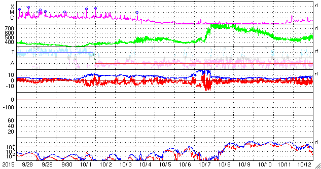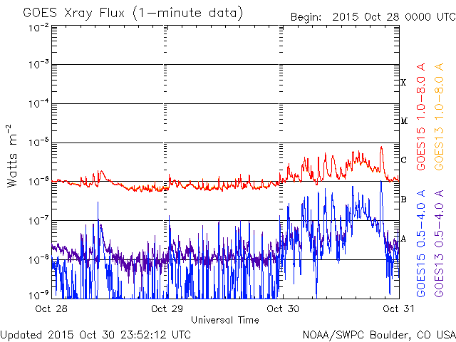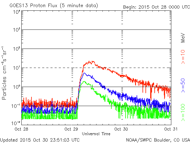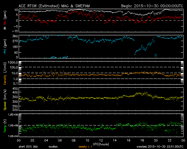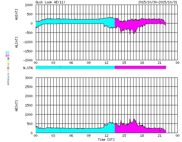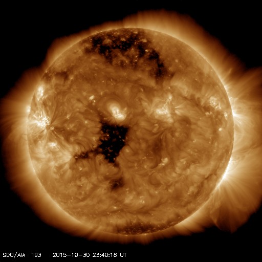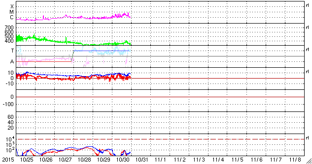 2015/10/31 08:52 更新 2443黒点群の活動が高まっています。コロナホールが太陽の中心に達しています。 担当 篠原 2443黒点群の活動が更に高まっています。 昨日のニュース以降、フレアの規模が次第に上がり、 C2〜4のフレアを繰り返し起こすようになりました。 30日の深夜には、C5.9、C5.2の小規模フレアを起こし、 今朝、31日5時(世界時30日20時)には、 C7.8と更に大きいCクラスフレアを起こしています。 SDO衛星AIA131による動画を掲載します。 連続的に活動が発生しています。 更に規模が高まってMクラスの発生に繋がるかもしれません。 今後の活動に注目して下さい。 一方、西の端(右端)で見えなくなった、 2436群や2437群でもフレアが発生していて、 C5.5、C5.9の変化を記録しています。 太陽の端に達しているので、 実際にはこれよりも大きい規模のフレアだった可能性があります。 太陽放射線(非常に高速の陽子の流れ)は、減少が続いています。 明日、明後日には、通常のレベルに戻りそうです。 太陽風は、速度は350km/秒と低速の状態で安定していますが、 磁場強度は8nT前後に少し強まった状態が続いています。 磁場の南北成分は、北寄りで変化していますが、 0nT付近になっている頃に、オーロラの活動を起こしていて、 AE指数に弱い変化が発生しています。 AE指数は、データの問題で、ずっと太くなる状態が続いています。 AE指数のグラフは、値としては500〜700nTの変化になっていますが、 実際の活動はもう一段小さい値ではないかと思います。 SDO衛星AIA193のコロナ写真を見ると、 赤道域のコロナホールが、太陽の中心線に到達しています。 ここから流れ出している高速の太陽風は、 3日後くらいに地球に到来すると考えると、 11月3日頃になるかもしれません。 27日周期の図の前周期を見ると、 10月7日以降に、750km/秒に達する高速の太陽風が到来しています。 この規模の太陽風の変化が、回帰してくるかもしれません。 ![]() 2443黒点群のフレア活動の様子。SDO衛星AIA131。 (c) SDO (NASA)、 (動画加工 : 宇宙天気ニュース) ![]() SDO衛星のAIA193カメラによる太陽コロナの様子 (c) SDO (NASA) ![]() SDO衛星による太陽の可視光写真。マウスの矢印を写真に重ねると、黒点番号付きの写真に切り替わります。 (c) SDO (NASA) ![]() GOES衛星の太陽X線データ (c) NOAA/SWPC ![]() GOES衛星の太陽放射線データ (c) NOAA/SWPC ![]() ACEが観測した太陽風の磁場(1番上の枠、白線は全体の強度、赤線は南北成分) および、太陽風の密度(3番目の橙線)、速度(4番目の黄線) (c) NOAA/SWPC ![]() リアルタイムAE指数 下段のAEグラフの値が高くなると、オーロラ活動が活発化しています。 (c) 京都大学, NICT ![]() 27日の太陽周期に合わせたデータプロット 太陽が同じ面を地球に向けていた27日前の変化から、今後を予想することができます。 (c) 作図:宇宙天気ニュース