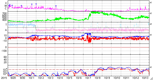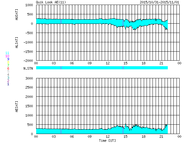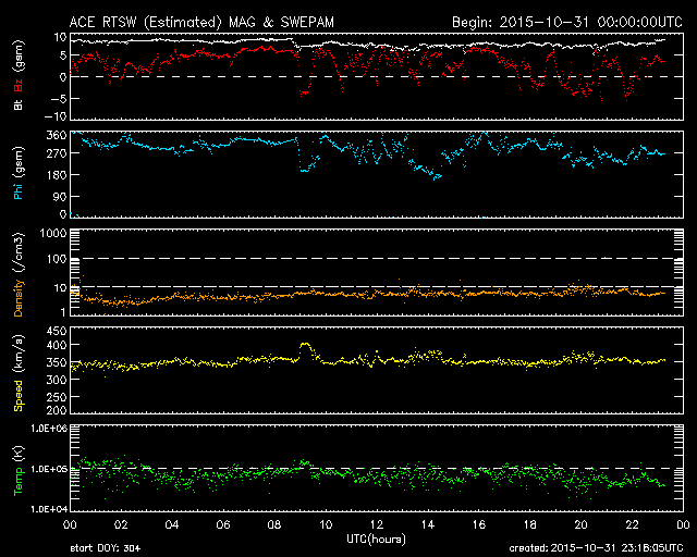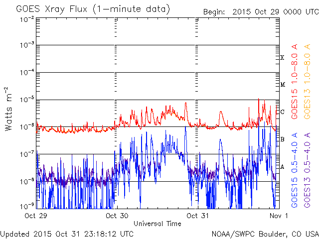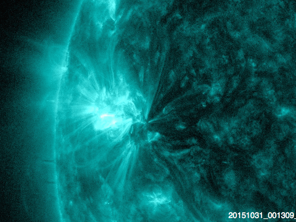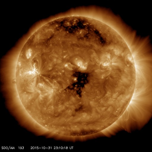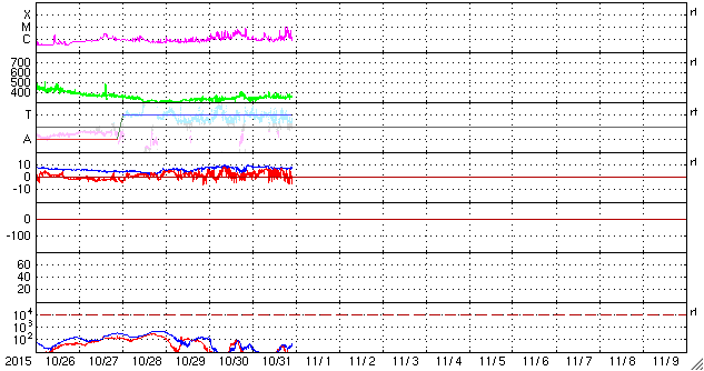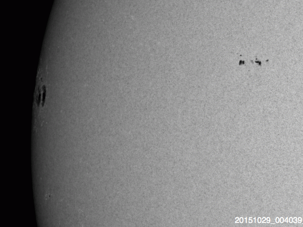 2015/11/ 1 08:19 更新 2443黒点群でM1.0などのフレアが続いています。 担当 篠原 2443黒点群で、フレアの発生が続いています。 活発に活動する様子を、SDO衛星AIA131の動画で紹介します。 2443黒点群は、昨日のニュースの後、 C3.8のフレアはありますが、半日ほどやや静かになっていました。 しかし、11月1日0時(世界時10月31日15時)に、 C5.2とやや大きいCクラスフレアを起こし、 直後の11月1日3時(世界時10月31日18時) には、 M1.0とぎりぎりですが、 Mクラスに達する中規模フレアを起こしました。 その後も、C6.6、C9.9、C5.8と、 規模の大きいCクラスフレアを起こし続けています。 2443群は、黒点の発達も目立っていて、 昨日の可視光写真と比較すると、 黒点がずらっと横に並ぶように現れています。 2443群が太陽の東端に出現した以降の変化を、 SDO衛星可視光写真の動画で紹介します。 黒点が活発に出没する様子をご覧下さい。 引き続き、2443黒点群の活動に注目して下さい。 これから太陽の中心に近付いていくので、 CMEを伴うようなフレアを起こした場合は、 地球への影響もより大きくなります。 太陽風は、350km/秒と低速の状態で安定しています。 磁場強度も、8nTと少し強まった値で安定しています。 27日周期の図の前周期ほどではありせんでしたが、 太陽風磁場の強まりは、ある程度残っていた様です。 磁場の南北成分は、北寄りから、 グラフの後半は、0nTを挟んで南北に変化するようになっています。 このため、AE指数も、前半は変化がなく静かですが、 後半から小規模の変化が見られる様になっています。 極域では、オーロラの弱い活動が見られているかもしれません。 SDO衛星AIA193では、コロナホールが太陽の中心に見えています。 今日の写真を27日前と比較すると、 広がりは半分くらいに減っている様です。 すると、今回の高速太陽風は、 前回よりも規模が小さくなっているかもしれません。 ![]() 2443黒点群のフレア活動の様子。SDO衛星AIA131。 (c) SDO (NASA)、 (動画加工 : 宇宙天気ニュース) ![]() 太陽の東端に出現した後の2443黒点群の変化。SDO衛星可視光写真。 (c) SDO (NASA)、 (動画加工 : 宇宙天気ニュース) ![]() SDO衛星のAIA193カメラによる太陽コロナの様子 (c) SDO (NASA) ![]() SDO衛星による太陽の可視光写真。マウスの矢印を写真に重ねると、黒点番号付きの写真に切り替わります。 (c) SDO (NASA) ![]() GOES衛星の太陽X線データ (c) NOAA/SWPC ![]() ACEが観測した太陽風の磁場(1番上の枠、白線は全体の強度、赤線は南北成分) および、太陽風の密度(3番目の橙線)、速度(4番目の黄線) (c) NOAA/SWPC ![]() リアルタイムAE指数 下段のAEグラフの値が高くなると、オーロラ活動が活発化しています。 (c) 京都大学, NICT ![]() 27日の太陽周期に合わせたデータプロット 太陽が同じ面を地球に向けていた27日前の変化から、今後を予想することができます。 (c) 作図:宇宙天気ニュース