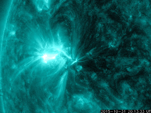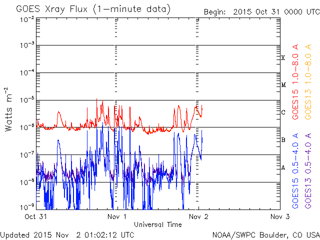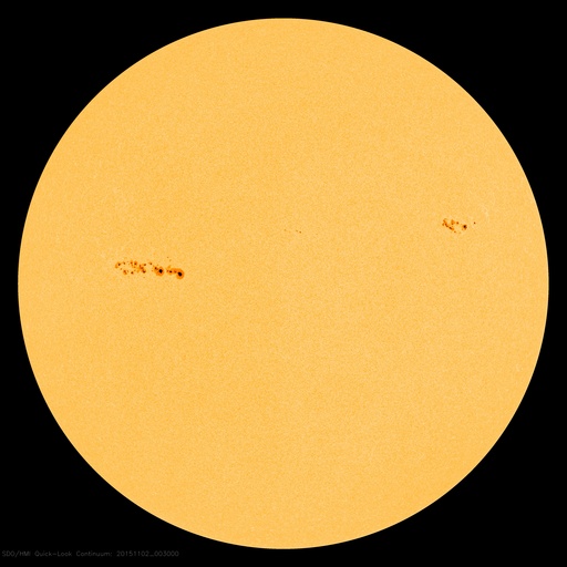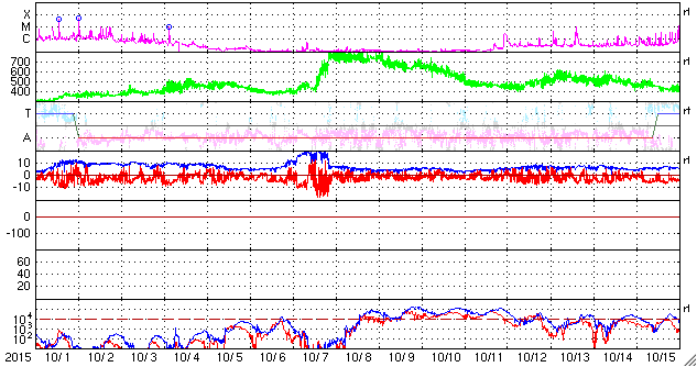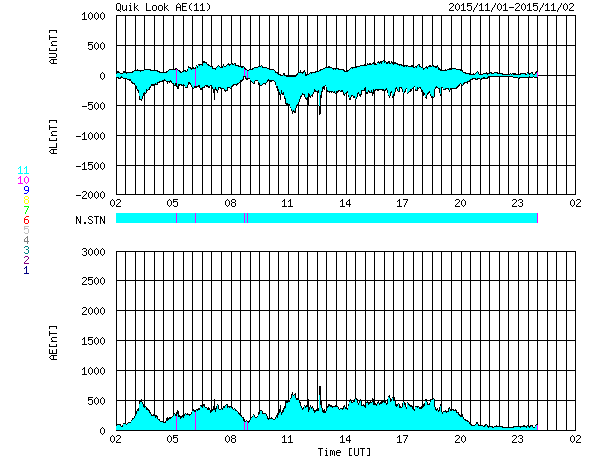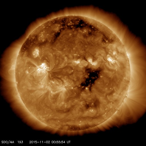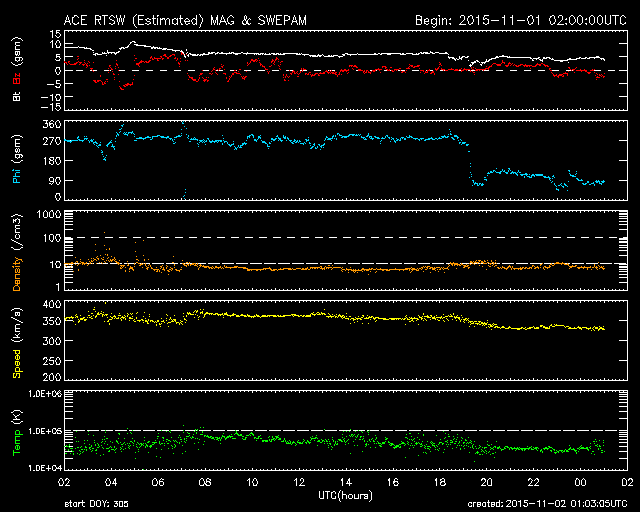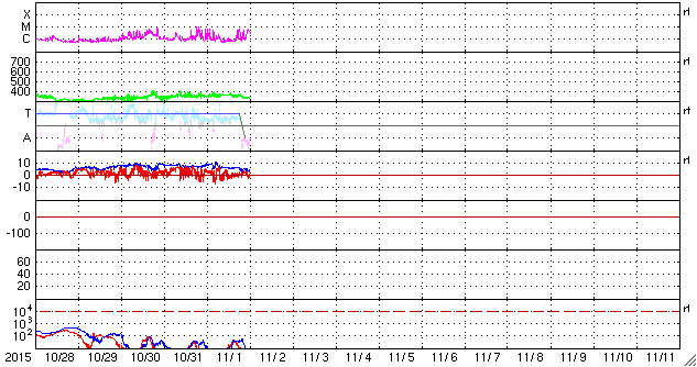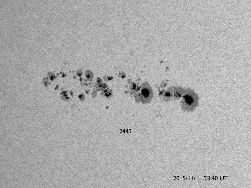 2015/11/ 2 10:01 更新 2443黒点群の活動は続いています。明日くらいからコロナホールの影響が始まりそうです。 担当 篠原 2443黒点群は活発に活動を続けています。 昨日のニュース以降、 C6.1、C6.5、C6.2、C5.6、C5.0、C6.3、C6.4と、 C5以上のフレアを7回、それ以下のフレアを9回起こしています。 活動の様子を、SDO衛星AIA131の動画で紹介します。 大小様々な活動が、休みなく発生しています。 また、可視光写真では、 2443黒点群は横に長く、多数の黒点が並んでいます。 発生しているフレアの規模は、少し小さくなっていますが、 黒点の規模は保たれており、 再び、Mクラスのフレアを起こすようになる可能性があります。 引き続き注目して下さい。 また、昨日の昼頃から、 2442黒点群の左に急に黒点が発達して、 2445黒点群と番号が付けられています。 これから、フレアの活動も強まるかもしれません。 太陽風は、速度は350km/秒から330k/秒へ下がっています。 8nTにやや高まっていた磁場強度も、昨日の午後から下がり始め、 現在は5nTと平均的な値に戻っています。 磁場の大まかな方向が切り替わる、セクター境界が到来した様で、 27日周期の図を見ると、「T」から「A」に変化しています。 AE指数は、500nT弱の小規模の活動が、 ほぼ一日にわたって続いています。 SDO衛星AIA193では、赤道のコロナホールが西に進み、 地球へ影響が及び始める目安の位置に近付いています。 明日くらいから、太陽風の磁場強度の強まりと、 それに続いて速度の高まりが到来する可能性があります。 前周期と比べると、コロナホールの広がりは半分くらいに減っていて、 27日周期の図の10月7日よりも、小さい変化に留まりそうです。 それでも、オーロラ活動の高まりなどに注目して下さい。