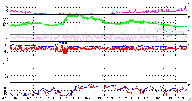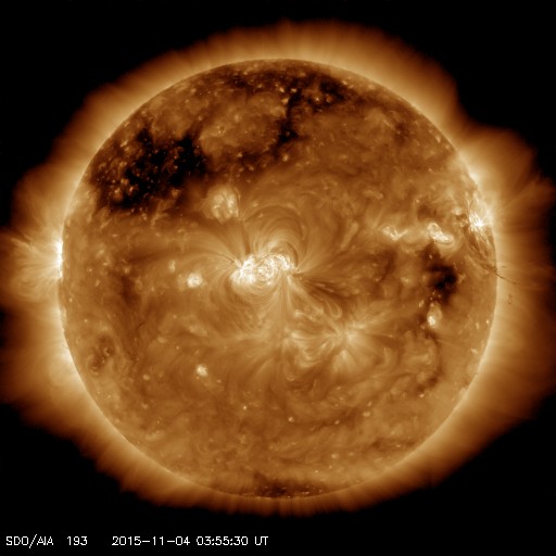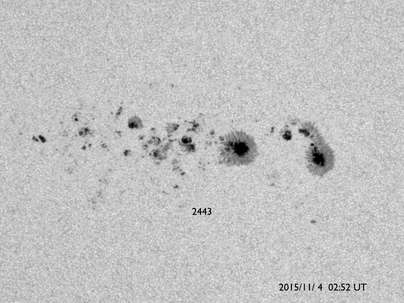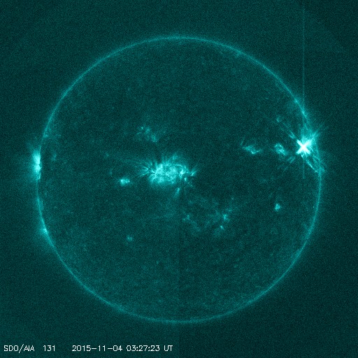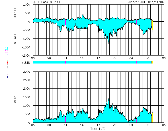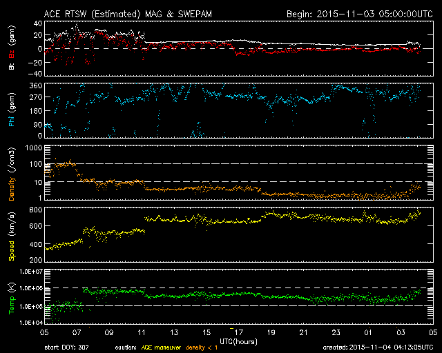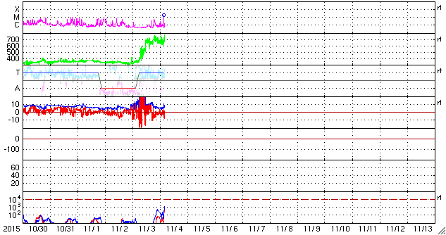 2015/11/ 4 13:12 更新 700km/秒台の高速太陽風が到来しました。オーロラの活動も高まっています。 担当 篠原 昨日のニュース以降、 太陽風の磁場強度は、20nTを超えて強まりました。 速度も追いかけるように上昇を始め、 3日16時(世界時3日7時)に500km/秒、 3日20時(世界時3日11時)には700km/秒に高まりました。 27日周期の図を見ると、 半日ほど早く始まりましたが、前周期と同程度の高速風になっています。 太陽風の強まりとともに、オーロラの活動も高まって、 AE指数は、700〜1000nTの中規模の変化が続き、 最大は、1400nTの変化になっています。 初めの頃の、AE指数が700nTくらいの変化をしていた時間帯の、 アラスカのオーロラを動画で紹介します。 雲と月明かりで、条件はやや厳しいですが、 繰り返し、夜空をオーロラが彩っています。 現在の太陽風は、 速度は700km/秒前後と高まった状態が続いていますが、 磁場強度は5nTと平均的な値に戻っています。 前周期は、続いてやってきた高速風領域と繋がって、 一週間近く高速風が続きましたが、 今回は、コロナホールの領域が小さくなっているので、 短い期間で一旦終わるかもしれません。 引き続き注目して下さい。 太陽のフレア活動は、2443黒点群で、C5.5、 2445黒点群で、C3.9、C3.0程度とややおとしなしく、 と書きかけたところで、 2445黒点群でM1.9の中規模フレアが発生しました。 短時間の増光で、SOO衛星AIA131の写真を掲載します。 2443群と2445群の活動には、引き続き注目して下さい。
