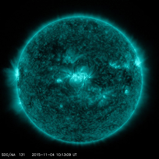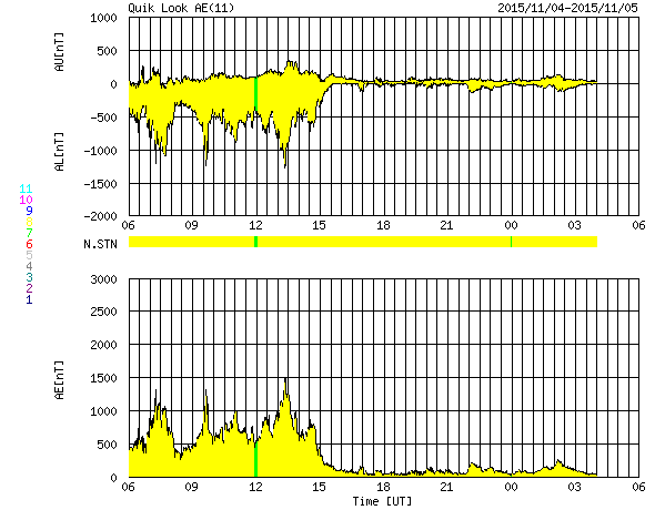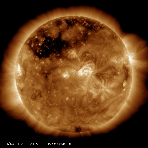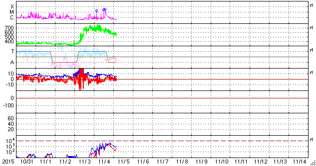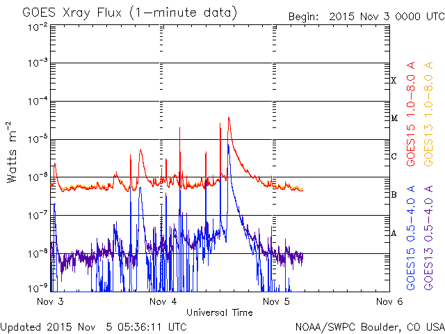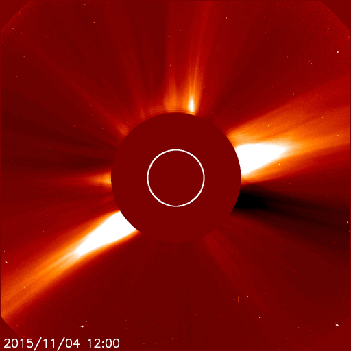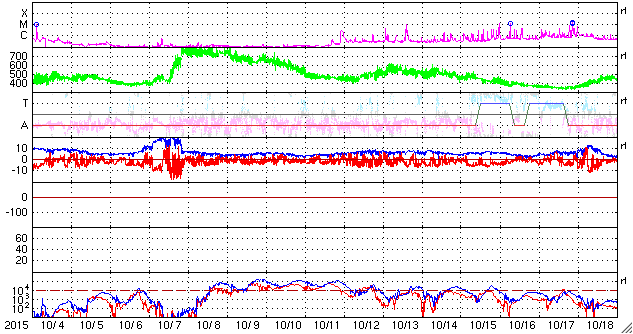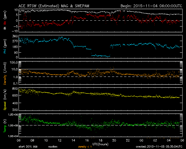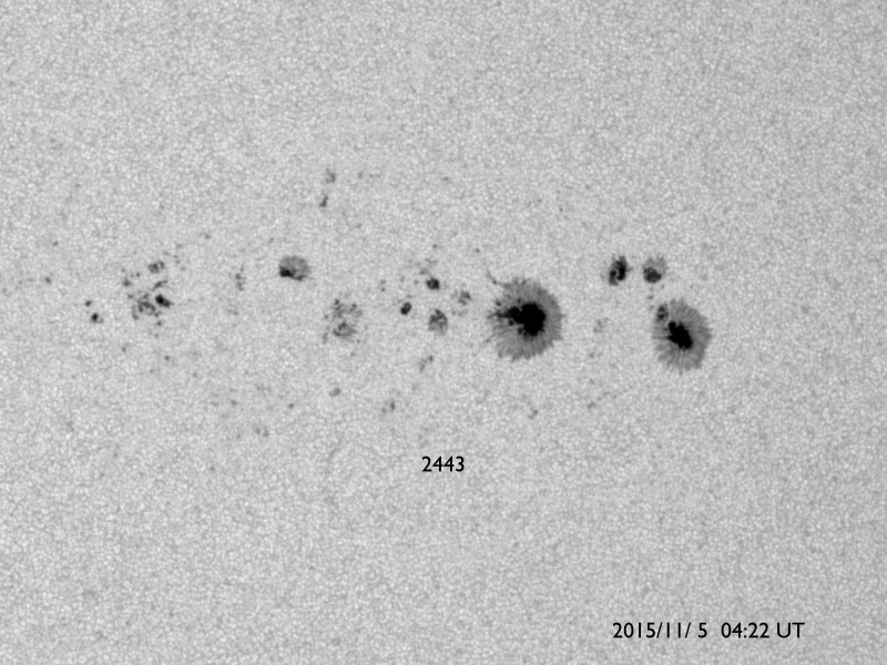 2015/11/ 5 14:36 更新 M3.7、M2.5の中規模フレアが発生しています。CMEが発生し、太陽風の擾乱が到来しそうです。 担当 篠原 昨夜、4日22時半(世界時4日13時半)に、 2443黒点群でM3.7の中規模フレアが発生しました。 フレアの様子を、SDO衛星AIA131、304の動画で紹介します。 AIA304(赤い写真)では、 コロナのガスが噴き出していく様子も見えています。 この噴出は、CMEとなって飛び出した様で、 SOHO衛星LASCO C2、C3でも、ガスの広がりが撮影されています。 太陽の中心部で発生したので、 噴出したガスは地球へ向かっていると思われます。 到来まで2〜3日程度と考えると、明後日、7日くらいになりそうです。 速度の高まりも重要ですが、 磁場の強まりが到来して、南向きに大きく変化すると、 磁気圏の擾乱はより大きな規模に発達します。 明日の夜以降、太陽風の変化に注目して下さい。 2443黒点群の拡大写真も掲載します。 黒点の様子は、昨日よりも寂しくなっています。 2443群としては、弱まる方向にある様です。 太陽の西の端に沈みかけている2445黒点群でも、 M1.9、M2.5の中規模フレアが発生しています。 (M1.9は昨日お知らせしたフレアです) もう、没しかけているので、今後は影響はなくなります。 また、東の端から新しく2448黒点群が姿を現しています。 C1.0の小さいフレアも起きていますが、 どの様な活動度の黒点群でしょうか。 太陽風は、700km/秒から550km/秒へ速度が低下していますが、 高速の状態は続いています。 磁場強度は、再び10nT近くに高まったのですが、 現在は5nTに戻っています。 高速風の領域は後半に入っていると思われますが、 これからCMEの乱れが重なって、乱れはしばらく継続しそうです。 磁気圏の活動は、昨日まで(世界時4日15時頃まで)は活発で、 AE指数は1000nT前後の大きな変化が続いていました。 しかし、今日に入った頃から太陽風の磁場が北寄りに変わり、 AE指数は急に変化がなくなっています。 違いがとてもはっきりしていて、南北磁場の影響がよく分かります。 ![]() 2434黒点群で発生したM3.7のフレア。SDO衛星AIA131、304。 (c) SDO (NASA)、 (動画加工 : 宇宙天気ニュース) ![]() M3.7のフレアに伴って発生したCME。SOHO衛星LASCO C2、C3。 (c) SOHO (ESA & NASA)、 (動画加工 : 宇宙天気ニュース) ![]() 2443黒点群の拡大写真。SDO衛星。 (c) SDO (NASA)、作図:宇宙天気ニュース ![]() SDO衛星のAIA193カメラによる太陽コロナの様子 (c) SDO (NASA) ![]() SDO衛星による太陽の可視光写真。マウスの矢印を写真に重ねると、黒点番号付きの写真に切り替わります。 (c) SDO (NASA) ![]() GOES衛星の太陽X線データ (c) NOAA/SWPC ![]() ACEが観測した太陽風の磁場(1番上の枠、白線は全体の強度、赤線は南北成分) および、太陽風の密度(3番目の橙線)、速度(4番目の黄線) (c) NOAA/SWPC ![]() リアルタイムAE指数 下段のAEグラフの値が高くなると、オーロラ活動が活発化しています。 (c) 京都大学, NICT ![]() 27日の太陽周期に合わせたデータプロット 太陽が同じ面を地球に向けていた27日前の変化から、今後を予想することができます。 (c) 作図:宇宙天気ニュース