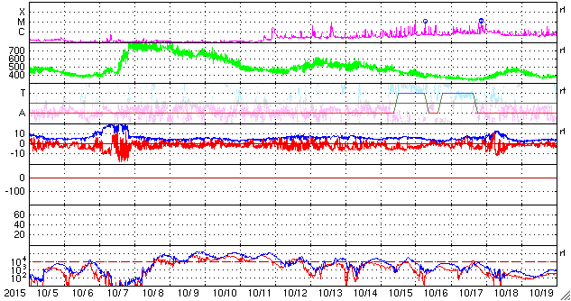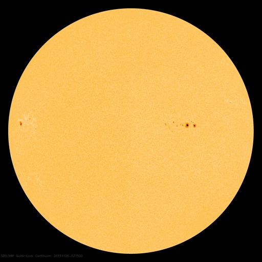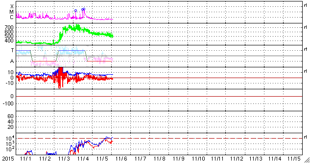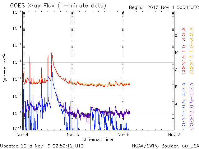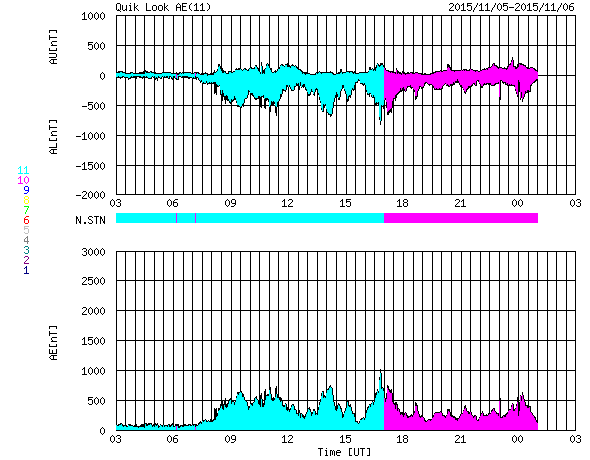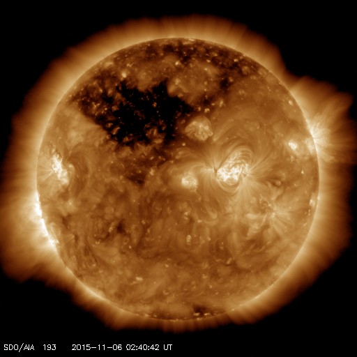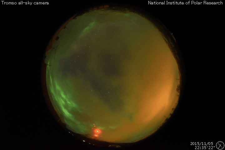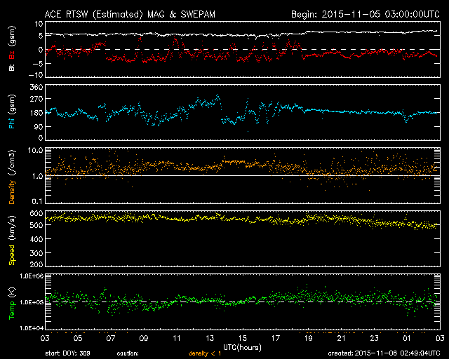 2015/11/ 6 11:50 更新 高速の太陽風は続いています。明日くらいに太陽風の乱れが到来しそうです。 担当 篠原 太陽風の速度は、昨日より550km/秒で安定していましたが、 今朝から少し下がり始め、現在は500km/秒を割りかけています。 高速風は続いていますが、勢いは弱まる傾向にある様です。 磁場強度は、5〜6nTと平均的な状態が続いています。 磁場の南北成分は、-2〜-3nTくらいですが、南向きが続いています。 このため、磁気圏の活動もやや高まった状態が続いていて、 AE指数は、300〜700nTの小中規模の変化が連続しています。 ノルウェー北部のトロムソのオーロラの様子を、 全天カメラの動画で紹介します。 世界時5日23時頃の活動で、 この頃のAE指数は、300nT程度の変化を示しています。 昨日のニュースで紹介したように、 M3.7の中規模フレアに伴って噴出したCMEによる太陽風の乱れが、 現在地球に向かっています。 到来まで2日半〜3日くらいかかると考えると、 明日の昼から夜にかけて地球に達すると予想されます。 擾乱の到来後に磁場が強まって、南向きに大きく変化すると、 磁気圏の活動はより激しくなります。 ACE衛星のデータや、オーロラのライブカメラなどに注目して下さい。 太陽は、M3.7のフレア以降は、一気に静かになっています。 2445黒点群が西に沈んだため、X線グラフの強度は一段下がり、 変化も少なくなっています。 東端から現れた2448黒点群も、目立った変化は起きていません。 一方、東端の向こう側に、活発に活動する領域がある様です。 これから、どの様な領域が姿を現すでしょうか。 ![]() ノルウェー・トロムソの全天カメラにより撮影された、世界時5日23時頃のオーロラ。 (c) 国立極地研究所、(動画加工 : 宇宙天気ニュース) ![]() SDO衛星のAIA193カメラによる太陽コロナの様子 (c) SDO (NASA) ![]() SDO衛星による太陽の可視光写真。マウスの矢印を写真に重ねると、黒点番号付きの写真に切り替わります。 (c) SDO (NASA) ![]() ACEが観測した太陽風の磁場(1番上の枠、白線は全体の強度、赤線は南北成分) および、太陽風の密度(3番目の橙線)、速度(4番目の黄線) (c) NOAA/SWPC ![]() リアルタイムAE指数 下段のAEグラフの値が高くなると、オーロラ活動が活発化しています。 (c) 京都大学, NICT ![]() 27日の太陽周期に合わせたデータプロット 太陽が同じ面を地球に向けていた27日前の変化から、今後を予想することができます。 (c) 作図:宇宙天気ニュース