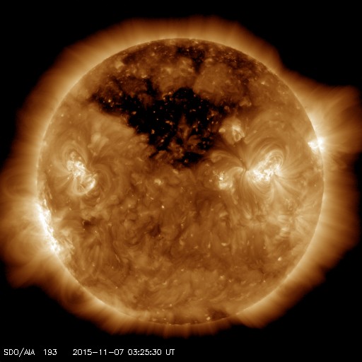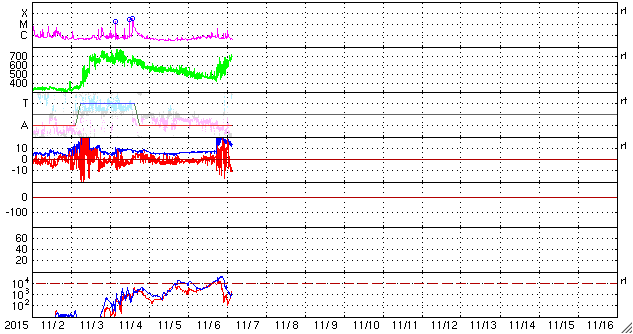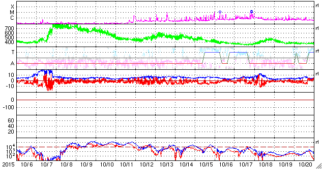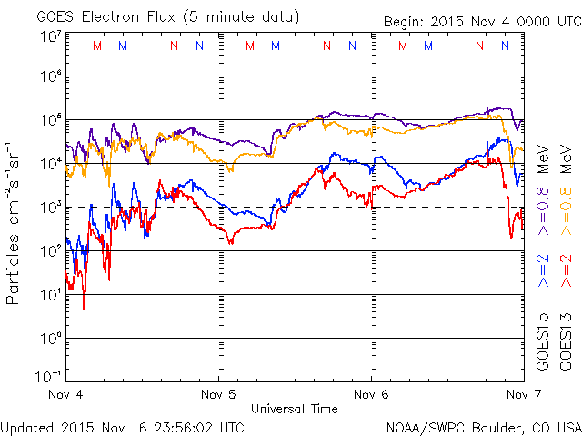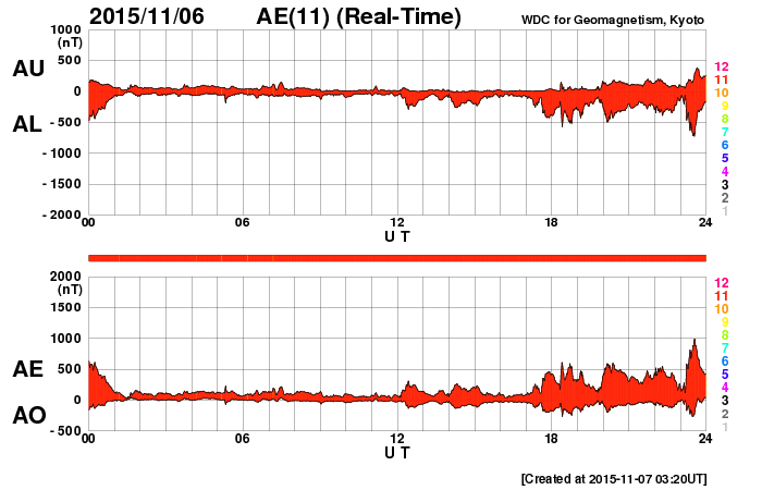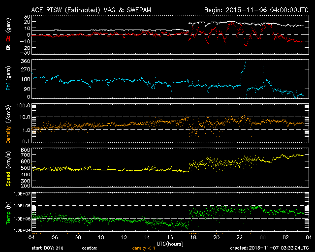 2015/11/ 7 12:32 更新 太陽風の乱れが到来しました。4日のニュージーランドのオーロラをどうぞ。 担当 篠原 ニュージーランド南島クィーンズタウンの米戸 実さんより、 世界時4日9時半から12時半にかけて撮影された、 オーロラの写真をいただきました。 現地では、4日22時半から5日1時半とのことです。 5日のニュースでお知らせした、高速太陽風の最中の活動です。 この頃まで太陽風磁場は南向きになっていて、 オーロラの活動を高めていましたが、 この後に北向きに切り替わり、オーロラは静かになっています。 3枚目では、おうし座流星群の火球が写ったそうです。 全天で一番明るい恒星であるシリウスを凌駕する明るさだったそうです。 この夜は、この他にも火球が多数流れたそうです。 オーロラの色合いと、見事な光の柱をご覧下さい。 これに流星群が重なって、素晴らしい夜になったのでしょうね。 印象的な写真をどうもありがとうございます。 太陽風の擾乱が、深夜に到来しています。 ACE衛星の観測では、7日2時半(世界時6日17時半)に急な変化が発生して、 速度は、450km/秒から550km/秒へ、 磁場強度は、5nTから15nTへそれぞれ高まっています。 この変化がCMEの到来によるものであれば、 フレアの発生から2日と4時間で到来したことになります。 変化が始まって10時間ほど経過した現在、 速度は700km/秒へ更に高まり、 磁場強度も10nTを超える程度に強まった状態が続いています。 磁場の南北成分は、+10nTから -10nTくらいの範囲で南北に変化しています。 速度が高まっていることもあり、磁気圏の活動は高まりそうですが、 AE指数の変化は、500nT前後と特に激しくはなっていません。 現在、速度が更に上がる一方、 磁場強度は強まったまま、南向きの変化が続いています。 この傾向が続けば、オーロラの活動は更に高まりそうです。 引き続き、ライブカメラなどに注目して下さい。 また、SDO衛星AIA193の太陽コロナ写真では、 北半球の中緯度域に、コロナホールが大きく広がっています。 続いて、こちらの影響もやって来るでしょう。 太陽風の変化を受けて、放射線帯の高エネルギー電子が増加しています。 GOES15(青線)は、昨日から10,000に達していたのですが、 今日は更に増えて、GOES13(赤線)も10,000に達しています。 太陽風の乱れがしばらく続きそうなので、 こちらの推移にも注目して下さい。 太陽は、東端から新しく黒点が現れ、 2449群と番号が付けられています。 C4.4の小規模フレアを起こしています。 また、2448群でも、C3.0のフレアが発生しています。 どちらも東側にあるので、 今後発達するようだと、注意が必要になるでしょう。