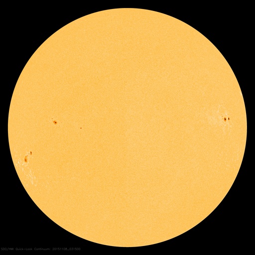 SDO衛星による太陽の可視光写真。マウスの矢印を写真に重ねると、黒点番号付きの写真に切り替わります。