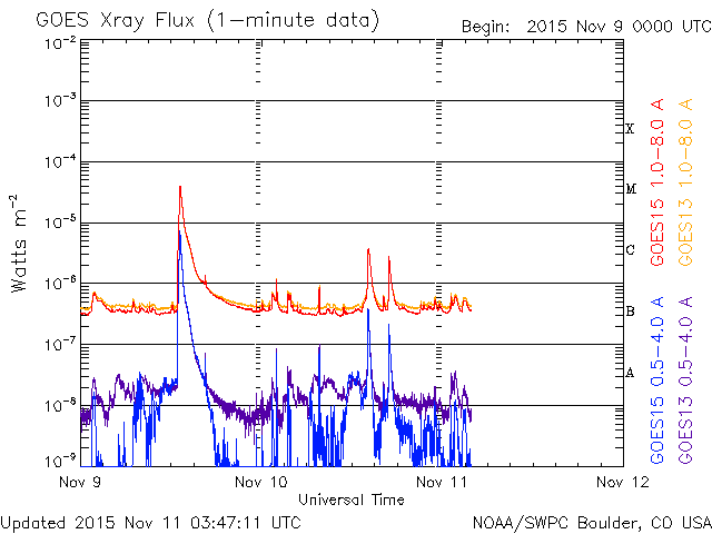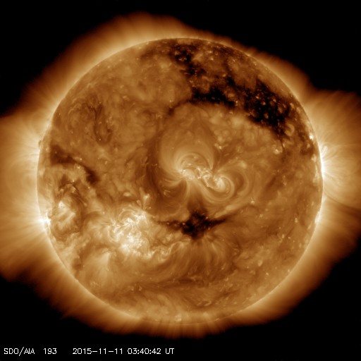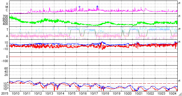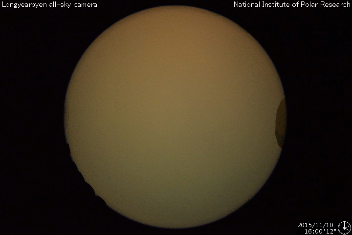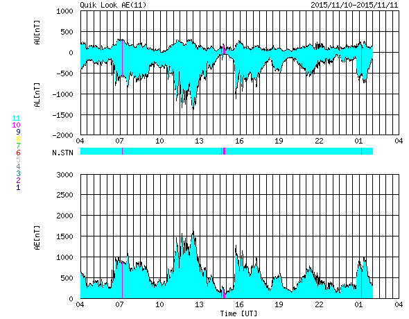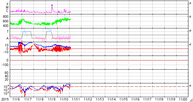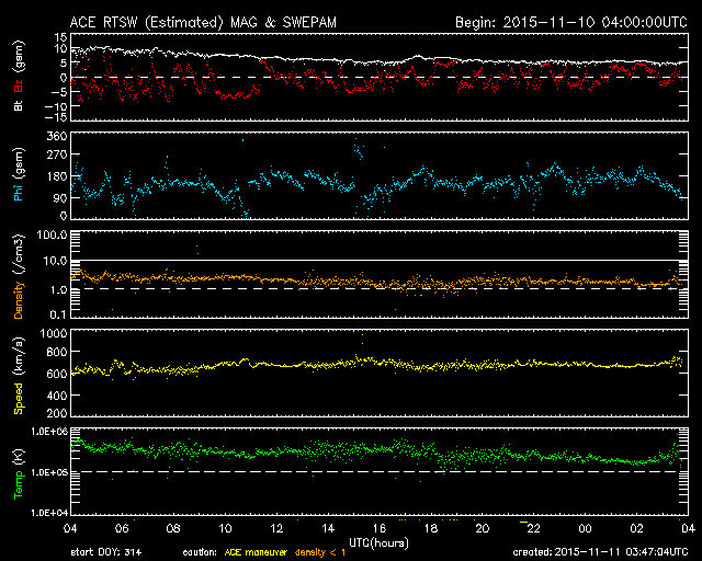 2015/11/11 12:47 更新 太陽風は700km/秒の高速風になっています。CMEの乱れも近づいています。 担当 篠原 太陽風の速度は、600km/秒から700km/秒へ更に上がり、 かなり高速の状態になっています。 コロナホールからしっかりと高速風がやって来ているようです。 一方、太陽風の磁場強度は、10nTから5nTへ下がっていて、 現在は、高速風領域の中盤に入っている様です。 磁場の南北成分は、振れ幅が次第に小さくなっていますが、 南北に変化が続いています。 このため、磁気圏の活動は活発な状態が続いていて、 AE指数は、1000nTや1500nTに達する激しい変化が 頻繁に発生しています。 世界時10日16〜18時頃のオーロラの様子を、 ノルウェー・スバールバル島の全天カメラの動画で紹介します。 この頃、AE指数は1000nTに達していました。 この高速太陽風に乗って、 CMEによる太陽風の乱れが地球に近付いていると思われます。 今夜以降、ACE衛星のデータに注目して下さい。 現在の太陽風の速度が高いので、 擾乱の到来も早めになるかもしれません。 磁場の強まりがやって来て、南向きに強い変化をもたらすと、 磁気圏でもより規模の大きい乱れが発生します。 今回はどの様に変化するでしょうか。 太陽では、西の端に沈んで行った2443黒点群でC3.7、 東端の新しい領域でC2.7の小規模フレアが発生しています。 しかし、全体としては穏やかな印象です。 放射線帯の高エネルギー電子は、 GOES13、15の両衛星で10,000のレベルを超えて増加しています。 高まった状態は、一週間近く続いています。 ![]() ノルウェー・スバールバル島のLongyearbyenで全天カメラにより撮影された、世界時10日16〜18時のオーロラ。 (c) 国立極地研究所、(動画加工 : 宇宙天気ニュース) ![]() SDO衛星のAIA193カメラによる太陽コロナの様子 (c) SDO (NASA) ![]() SDO衛星による太陽の可視光写真。マウスの矢印を写真に重ねると、黒点番号付きの写真に切り替わります。 (c) SDO (NASA) ![]() ACEが観測した太陽風の磁場(1番上の枠、白線は全体の強度、赤線は南北成分) および、太陽風の密度(3番目の橙線)、速度(4番目の黄線) (c) NOAA/SWPC ![]() リアルタイムAE指数 下段のAEグラフの値が高くなると、オーロラ活動が活発化しています。 (c) 京都大学, NICT ![]() 27日の太陽周期に合わせたデータプロット 太陽が同じ面を地球に向けていた27日前の変化から、今後を予想することができます。 (c) 作図:宇宙天気ニュース