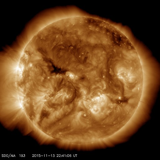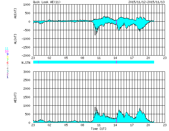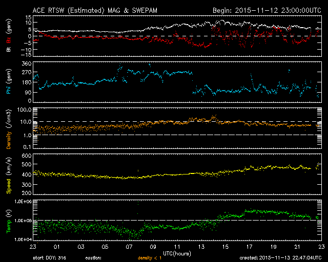 2015/11/14 07:48 更新 太陽風の小規模の高まりが到来しています。太陽は穏やかです。 担当 篠原 昨日の午後から、太陽風の磁場強度が5nTから10nTに上がり、 速度も、380km/秒から470km/秒へ高まる変化が見られました。 CMEの発生からは4日が経過していて、 時間がかかり過ぎているように思います。 一方、27日周期の図を見ると、 前周期の10月18日にも太陽風の小さい高まりが到来していて、 この小規模の変化が戻って来たのかもしれません。 現在の太陽風は、磁場強度は5nTに戻っています。 速度は450km/秒とやや高まっていますが、 既に変化のピークは過ぎているようです。 この太陽風の乱れに伴って、 太陽風磁場の南北成分が、-5nTと南向きにやや強まっています。 この影響でオーロラの活動も高まっていて、 AE指数のグラフは、変化が到来した後半から、 800nTくらいの中規模の変化が続いています。 太陽風の乱れは収まってきているので、 磁気圏の変化も次第に弱くなっていくでしょう。 SDO衛星AIA193の太陽写真は、 中央部の東側(左側)に小さいコロナホールがある程度です。 太陽風はしばらく穏やかに推移しそうです。 太陽も、昨日お知らせしたC1.2以降、特にフレアの発生はなく、 穏やかな状態です。 黒点も小さいものばかりです。 放射線帯の高エネルギー電子は、 今回の太陽風の乱れの影響で、大きく減少しています。 2つの衛星ともに、10,000の線を割っています。