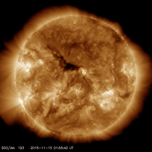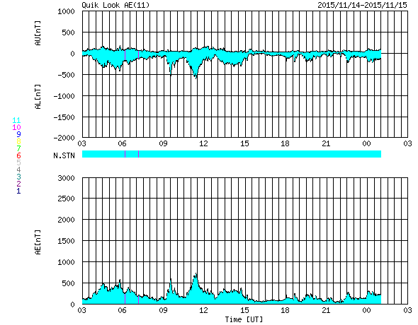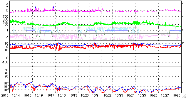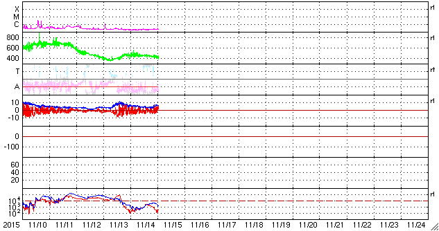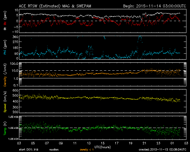 2015/11/15 11:09 更新 太陽風は平均的な状態に戻っています。太陽は穏やかです。 担当 篠原 昨日やや高まっていた太陽風の速度は、 今朝にかけて400km/秒へ下がり、平均的な速さに戻っています。 磁場強度は、5nTと平均的な状態で安定しています。 太陽風の弱い高まりは、前周期と同様に1日程度で終わっています。 太陽風磁場の南北成分は、 振れ幅は小さいですが、南北に変化しています。 このため、磁気圏でも小規模の変化が発生していて、 AE指数は300〜500nTくらいの変化が発生しています。 この後、太陽風が弱まっていくと、 磁気圏もより穏やかになっていくでしょう。 SDO衛星AIA193の太陽コロナ写真を見ると、 中央部に小さいコロナホールが見えています。 広がりが小さいので、影響も小規模だと思いますが、 3日後くらいに太陽風が少し強まるかもしれません。 太陽は、フレアの発生は特になく、 穏やかな状態が続いています。 ![]() SDO衛星のAIA193カメラによる太陽コロナの様子 (c) SDO (NASA) ![]() SDO衛星による太陽の可視光写真。マウスの矢印を写真に重ねると、黒点番号付きの写真に切り替わります。 (c) SDO (NASA) ![]() ACEが観測した太陽風の磁場(1番上の枠、白線は全体の強度、赤線は南北成分) および、太陽風の密度(3番目の橙線)、速度(4番目の黄線) (c) NOAA/SWPC ![]() リアルタイムAE指数 下段のAEグラフの値が高くなると、オーロラ活動が活発化しています。 (c) 京都大学, NICT ![]() 27日の太陽周期に合わせたデータプロット 太陽が同じ面を地球に向けていた27日前の変化から、今後を予想することができます。 (c) 作図:宇宙天気ニュース
