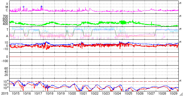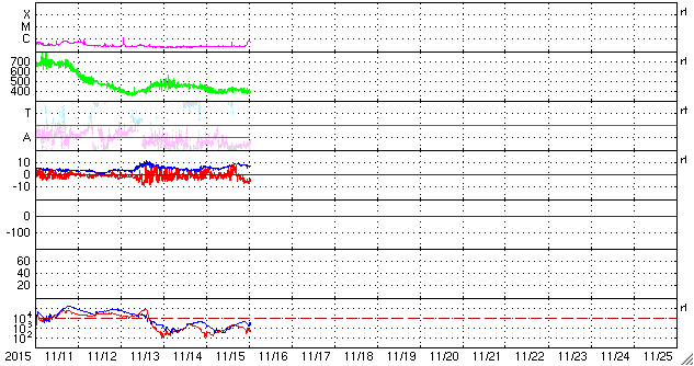 磁場の南北成分が、南向きの -5nTにやや強まっていて、