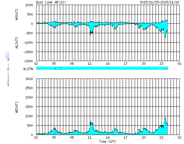 下段のAEグラフの値が高くなると、オーロラ活動が活発化しています。
