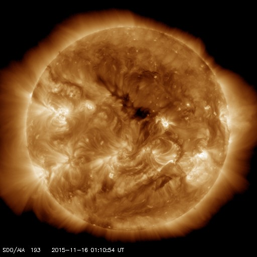 2015/11/12 12:19 高速の太陽風は続いていますが、速度は下がり始めています。