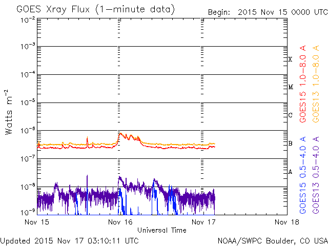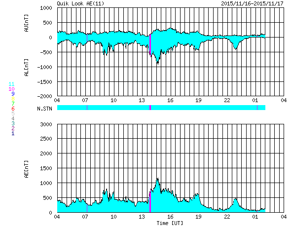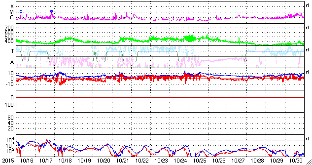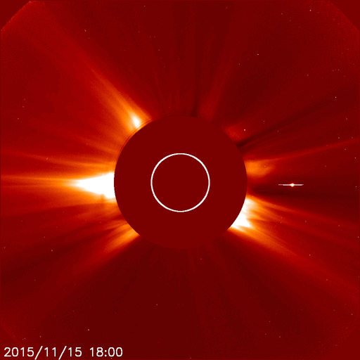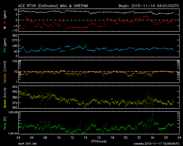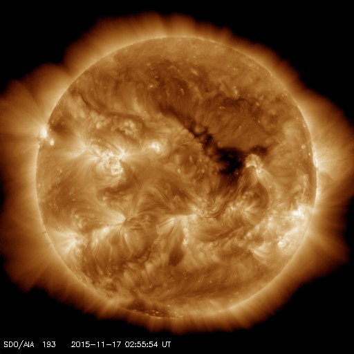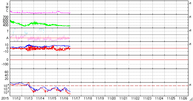 2015/11/17 12:10 更新 フィラメント噴出によるCMEの様子を紹介します。太陽風はやや低速です。 担当 篠原 昨日お知らせしたフィラメント噴出による CME(太陽ガスの放出現象)の様子を、 SOHO衛星LASCO C2、C3の動画で紹介します。 噴き出したガスの中心は、太陽から右に向かっています。 しかし、動画の広がりの様子から、 CMEの一部は地球へ向かっている可能性があります。 到来まで3〜4日程度かかると考えると、 変化は、19〜20日頃に始まるかもしれません。 速度の変化は小さいのではないかと思いますが、 磁場の強まりが流れてきて、南向きに大きく振れると、 磁気圏の活動を大きくする可能性があります。 擾乱が到来するかどうか、注目して下さい。 太陽では、フレアの発生はなくとても穏やかです。 X線グラフの強度も、下がった状態が続いています。 黒点も、微かに見えている程度です。 太陽風の速度は、370km/秒に下がって、 低速の風に変わりつつあります。 やや強まっていた磁場強度は、 現在は5nTと平均的な値に戻っています。 磁場の南北成分は、南寄りから、 0nT付近で小さく変化するように変わっています。 AE指数のグラフも、 500nTを超えるくらいの変化が続いていましたが、 後半からは、変化が小さくなっています。 さて、SDO衛星AIA193の太陽写真では、 中央部に広がっていたコロナホールが、 西に移動して、地球へ影響が及び始める位置に近付いています。 こちらの変化が明日くらいから始まるかもしれません。 これにCMEの乱れが重なって、 太陽風の変化が分かりにくくなりそうです。