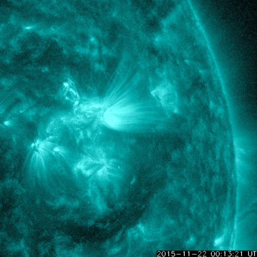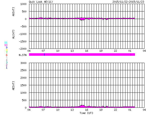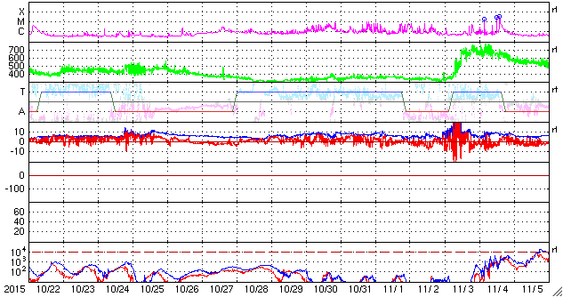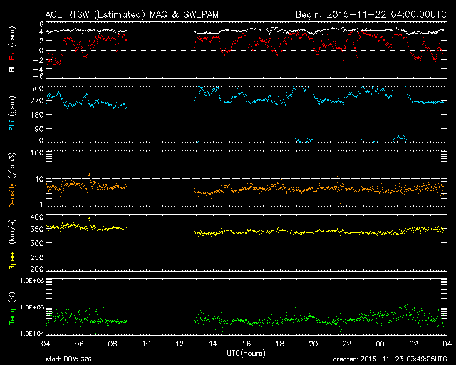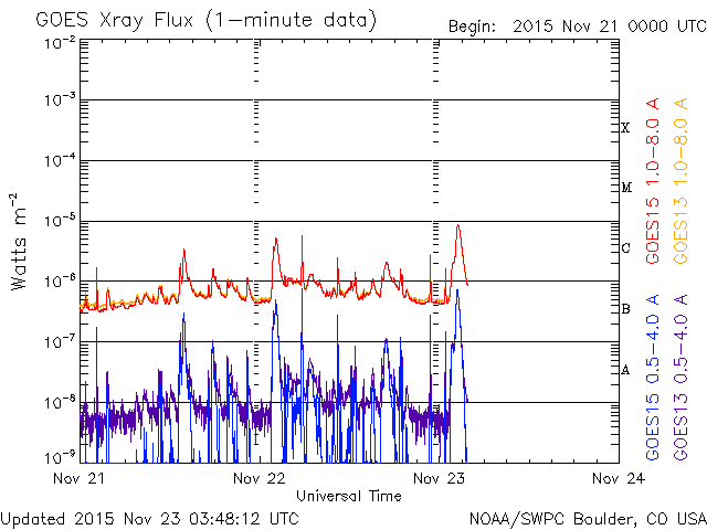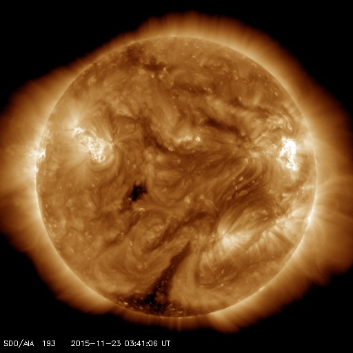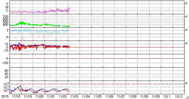 2015/11/23 12:49 更新 2454黒点群の活動が強まって、C8.7のフレアなどが発生しています。 担当 篠原 昨日のニュース以降、 太陽の北西(右上)の2454黒点群の活動が高まっています。 ニュースの直後の22日10時半(世界時22日1時半)にC5.1。 続いて、22日14時半(世界時22日5時半)にC5.6、 今朝、23日10時(世界時23日1時)にC8.7と、 規模の大きいCクラスフレアを起こす様になっています。 SDO衛星AIA193による、これらのフレアの様子を掲載します。 2454黒点群では、この他にもC1〜2の小さいフレアの発生が、 7回ほど記録されています。 今後、更に規模が高まるのかどうか、注目して下さい。 太陽風は、350km/秒と低速の風が続いています。 磁場強度は、4nTとやや弱くなっています。 磁場の南北成分は、北向きの傾向が続いています。 速度が下がっていることもあり、磁気圏は穏やかで、 AE指数はほとんど変化がありません。 27日周期の図の前周期の様に、 これから一週間程度、低速の太陽風が続くかもしれません。 一方、SDO衛星AIA193の太陽写真では、 中央部の東側(左側)に小さいコロナホールが見えています。 4日後くらいに弱い影響が見られるかもしれません。
