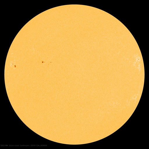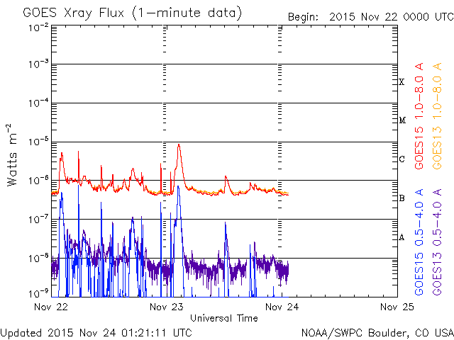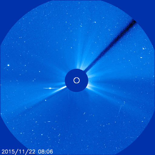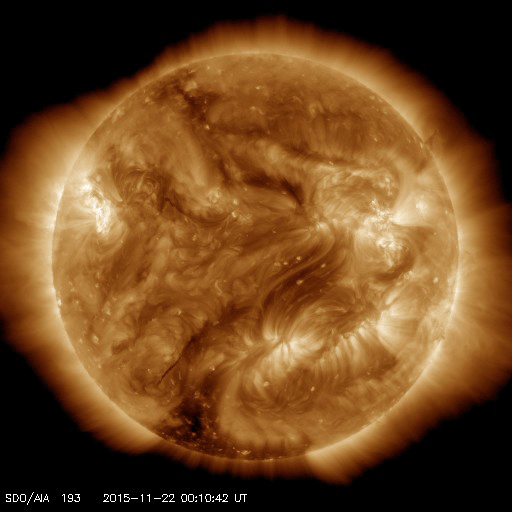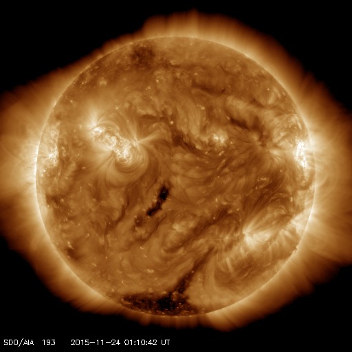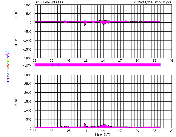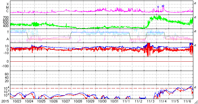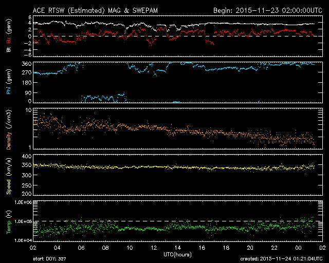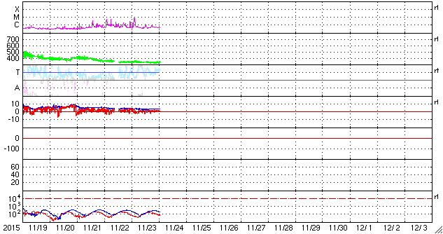 2015/11/24 10:21 更新 2454黒点群は静かになっています。太陽風は低速で、磁気圏も静穏です。 担当 篠原 昨日活動度が高まっていた2454黒点群は、 C8.7の小規模フレア以降は目立ったフレアを起こしておらず、 活動は静かになっています。 一方、東端の2458黒点群や、 その左側の太陽の端に近付いている領域で、 小さいフレアの発生が続いているようです。 今後の変化に注目して下さい。 一昨日、22日16時(世界時22日7時)の現象ですが、 太陽の南側(下側)でフィラメント噴出が発生しています。 SDO衛星AIA193による動画を掲載します。 この噴出により、CME(太陽ガスの放出現象)も発生しています。 SOHO衛星LASCO C3の動画を掲載します。 飛び出したガスは、太陽の左側に向かっています。 しかし、発生した場所が太陽の中心に近いので、 一部は地球へも向かっている可能性があります。 地球まで4〜5日程度かかると考えると、 26〜27日頃の太陽風に、小規模の変化が見られるかもしれません。 磁場が強まって、南向きに振れると、 磁気圏の活動が高まる可能性があります。 太陽風は、速度が350km/秒から330km/秒へ少し下がり、 より低速になっています。 磁場強度は、4nT前後で安定しています。 磁場の南北成分は、北寄りに推移しています。 磁気圏は静穏で、AE指数は小さい変化が見られる程度です。 SDO衛星AIA193では、 太陽の中心部に小さいコロナホールが見えています。 広がりが小さいので、あまり影響はなさそうです。 太陽風は低速の状態がしばらく続きそうです。