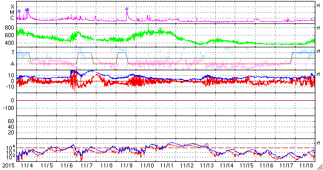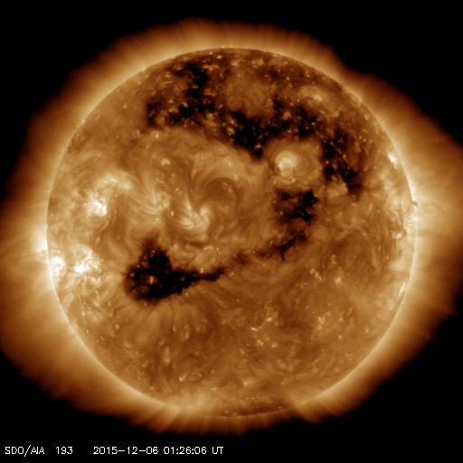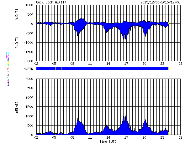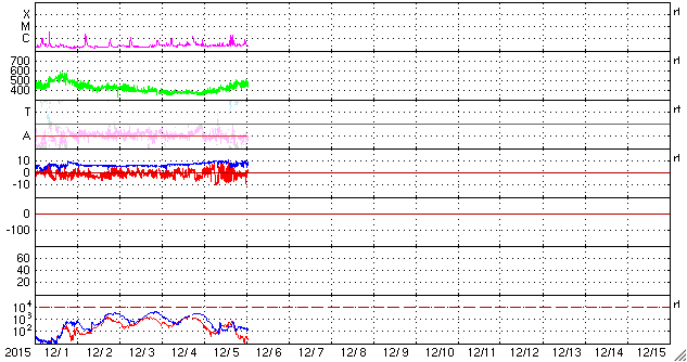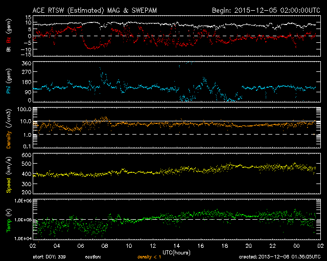 2015/12/ 6 10:36 更新 太陽風はやや高速になっています。コロナホールの影響が始まりそうです。 担当 篠原 太陽風の速度は、昨日から今日にかけて少し高まり、 460km/秒とやや高速になっています。 磁場強度も、8〜10nTと強まった状態です。 コロナホールの影響で、 太陽風が強まってきたのかもしれません。 SDO衛星AIA193の太陽写真では、 赤道付近のコロナホールも西側へ進んでいます。 このため、太陽風への影響はもう一段強まる可能性があります。 また、南東(左下)側のコロナホールの影響は 5日後くらいになりそうなので、 今週いっぱい、太陽風は高まった状態が続くかもしれません。 太陽風磁場の南北成分は、南寄りの傾向になっています。 磁場強度が高まっているので、南向きも強まりやすくなり、 磁気圏への影響もより大きくなっているようです。 AE指数のグラフでは、500〜1000nTの中規模の活動が、 数時間おきに発生しています。 にぎやかにオーロラの活動が続いているのではないでしょうか。 太陽は、C1.9の小規模フレアが2回、連続するように発生しています。 NOAAの報告では、2つとも2463黒点群の発生となっていますが、 SDO衛星の動画を見ると、 1つめは新しく現れた2464黒点群かもしれません。 フレアの規模は小さく、太陽は全体としては穏やかです。 ![]() SDO衛星のAIA193カメラによる太陽コロナの様子 (c) SDO (NASA) ![]() SDO衛星による太陽の可視光写真。マウスの矢印を写真に重ねると、黒点番号付きの写真に切り替わります。 (c) SDO (NASA) ![]() ACEが観測した太陽風の磁場(1番上の枠、白線は全体の強度、赤線は南北成分) および、太陽風の密度(3番目の橙線)、速度(4番目の黄線) (c) NOAA/SWPC ![]() リアルタイムAE指数 下段のAEグラフの値が高くなると、オーロラ活動が活発化しています。 (c) 京都大学, NICT ![]() 27日の太陽周期に合わせたデータプロット 太陽が同じ面を地球に向けていた27日前の変化から、今後を予想することができます。 (c) 作図:宇宙天気ニュース