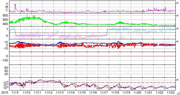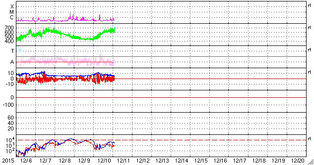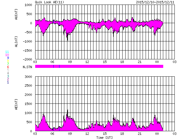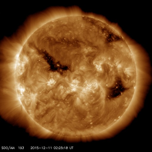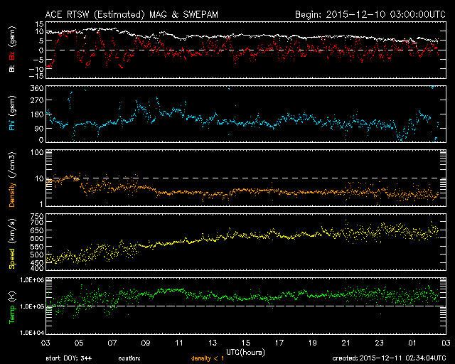 2015/12/11 11:32 更新 太陽風の速度は600km/秒台に上昇しています。昨日に続きムルマンスクのオーロラをどうぞ。 担当 篠原 昨日に続いて、 ロシア・ムルマンスクの福島留美さんよりいただいた、 オーロラの写真を紹介します。 撮影はおよそ1か月前の11月3日です。 コロナホールの影響で、700km/秒の高速太陽風が来ていました。 今回の写真は、全て異なる写真家による撮影です。 同じ夜に、それぞれ異なる場所からオーロラを狙っていたのですね。 福島さんによると、 「オーロラの色合いが撮影者の好みなどによって違い、 誰が撮影したか大体分かるようになってきた」とのことですが、 風景との組み合わせ方にも個性が出ているのだろうなと思います。 どの写真が一番素敵でしたか? 素晴らしい写真達をありがとうございました。 昨日のニュース以降、太陽風の速度は上昇を始め、 深夜、10日23時(世界時10日14時)頃に、600km/秒に達しました。 上昇はその辺りで終わり、 現在まで600〜650km/秒と高い速度の太陽風が続いています。 反対に磁場強度は10nTから低下していき、 今朝くらいに5nTと平均的な値に戻ったところです。 速度のグラフの通りですが、 高速太陽風は中盤の領域に入ったようです。 磁場の南北成分は、0nT付近で南北に小刻みに変化しています。 振れ幅はそれほど大きくないのですが、 速度が高まっているため影響は比較的大きくなり、 AE指数は500nTから1000nTに達する中規模の活動が続いています。 極域では、にぎやかなオーロラの発生が続いているかもしれません。 SDO衛星AIA193の太陽コロナ写真を見ると、 現在の高速風の原因となったコロナホールは、 南西(右下)に進んでいます。 次第に影響は弱まっていくでしょう。 一方、次のコロナホールが太陽の中心線に達しようとしています。 このコロナホールは、27日前よりも少し広がっています。 前周期の太陽風は、450km/秒に少し高まった程度でしたが、 今回の影響は、もう少し強まるかもしれません。 太陽は、東端から2468黒点群が現れています。 ここで、C3.9の小規模フレアが発生しています。 ![]() 11月3日にロシア・セヴェロモルスク市で撮影されたオーロラ。 (c) 福島留美氏、リュボーフィ・トリフォノワ女史 ![]() 11月3日にロシア・ムルマンスク州で撮影されたオーロラ。 (c) 福島留美氏、オレグ・セメンケーヴィッチ氏 ![]() 11月3日にロシア・ムルマンスク市で撮影されたオーロラ。 (c) 福島留美氏、オリガ・ムラヴェイ女史 ![]() 11月3日にロシア・カンダラクシャ市で撮影されたオーロラ。 (c) 福島留美氏、ロマン・アントーノフ氏 ![]() SDO衛星のAIA193カメラによる太陽コロナの様子 (c) SDO (NASA) ![]() SDO衛星による太陽の可視光写真。マウスの矢印を写真に重ねると、黒点番号付きの写真に切り替わります。 (c) SDO (NASA) ![]() ACEが観測した太陽風の磁場(1番上の枠、白線は全体の強度、赤線は南北成分) および、太陽風の密度(3番目の橙線)、速度(4番目の黄線) (c) NOAA/SWPC ![]() リアルタイムAE指数 下段のAEグラフの値が高くなると、オーロラ活動が活発化しています。 (c) 京都大学, NICT ![]() 27日の太陽周期に合わせたデータプロット 太陽が同じ面を地球に向けていた27日前の変化から、今後を予想することができます。 (c) 作図:宇宙天気ニュース