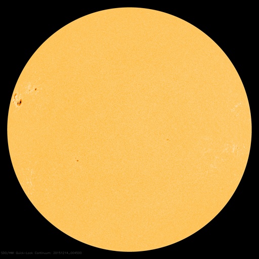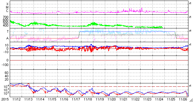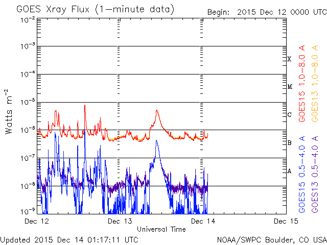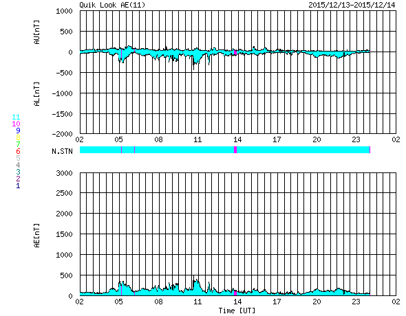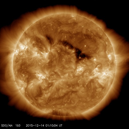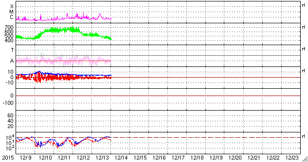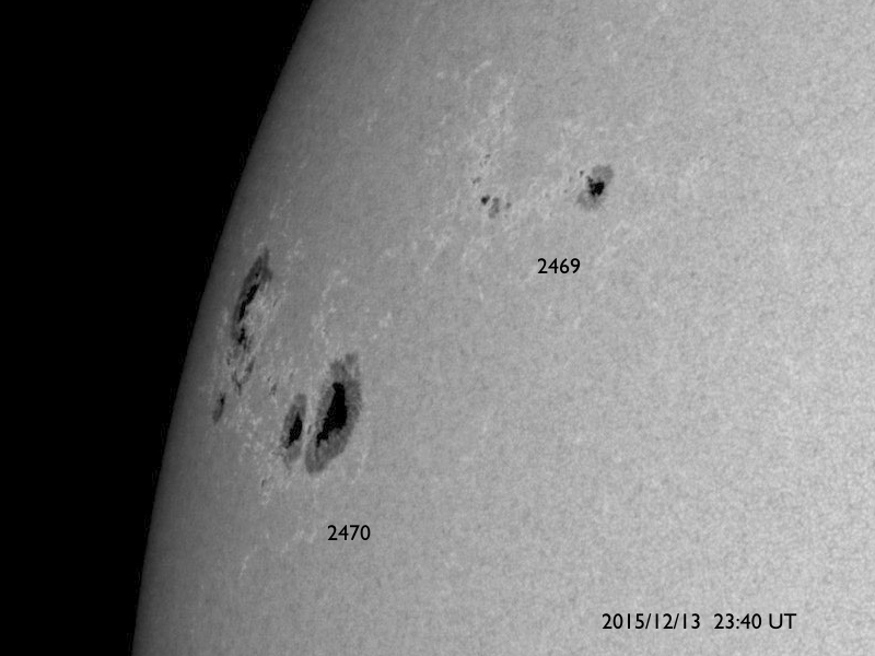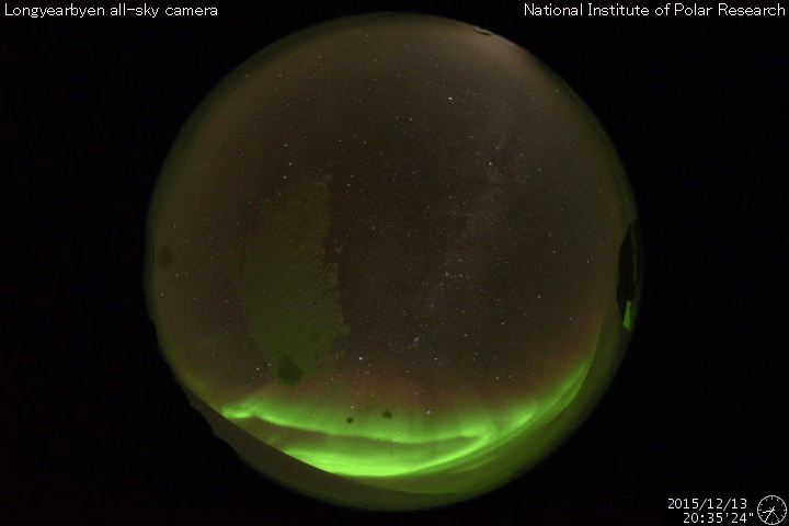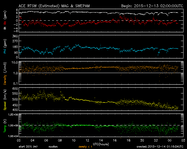 2015/12/14 10:16 更新 太陽風は平均的な速度に戻っています。2470黒点群が大きな姿を現しています。 担当 篠原 太陽風の速度は、 昨日の夕方までは500km/秒台を保っていましたが、 その後、470km/秒に下がり、 今朝になると、更に低下をして、 現在は420km/秒と平均的な速度に戻っています。 太陽の西の端へ行ったコロナホールの影響は、 完全に通り過ぎたようです。 磁場強度は、4nTで安定しています。 南北成分は、-2nTくらいの弱い南向きになっています。 磁気圏の活動は、規模は小さくなりましたが、 AE指数では、200〜300nTくらいの小さい変化が続いています。 その中の、世界時13日20〜22時頃の、 ノルウェー・スバールバル島のオーロラの様子を、 全天カメラの動画で紹介します。 冬至も近付いて、夜の時間がずいぶん長くなっています。 SDO衛星AIA193の太陽写真では、 中央部のコロナホールが西に進み、 影響の始まりが近付いています。 明日くらいに変化がやって来るかもしれません。 太陽は、東の端から現れた2470黒点群の 全体の姿が見えるようになっています。 なかなか規模の大きい黒点群で、SDO衛星による拡大写真を掲載します。 しかし、フレアの発生は少なくなっていて、 昨日のニュース以降、この領域のフレアは記録されていません。 太陽の南東部(左下)の2468黒点群で、 C5.3の小規模フレアが発生しています。 弱いCMEの噴出も起きているようです。 放射線帯の高エネルギー電子は、 10,000に高まった状態が続いています。