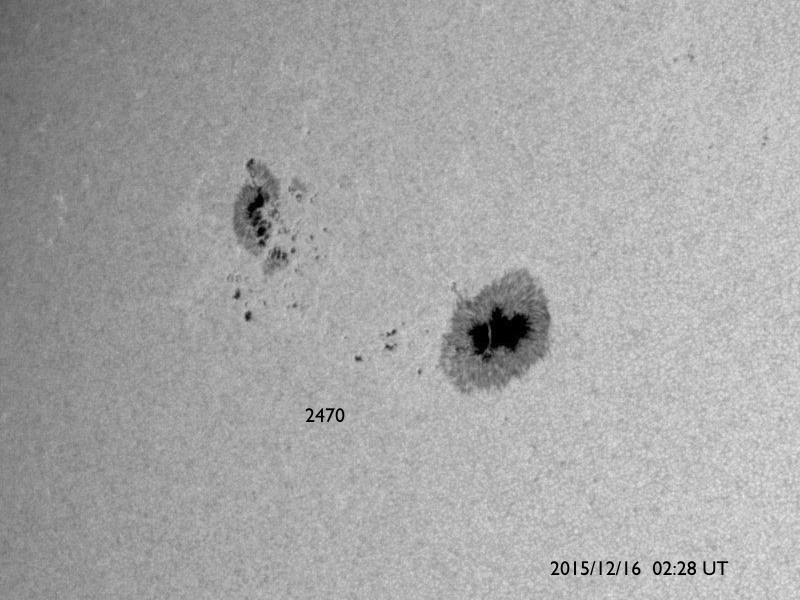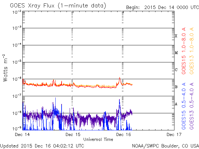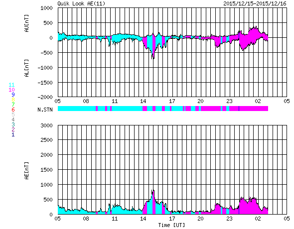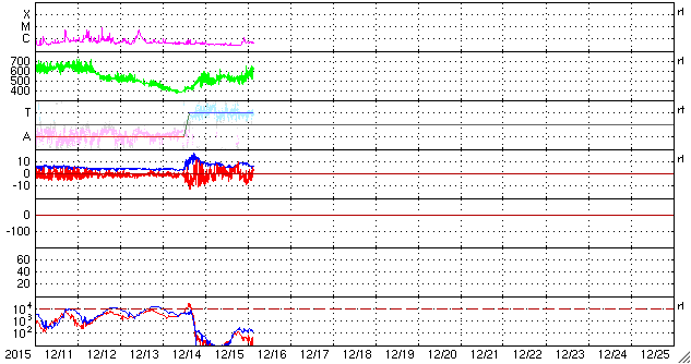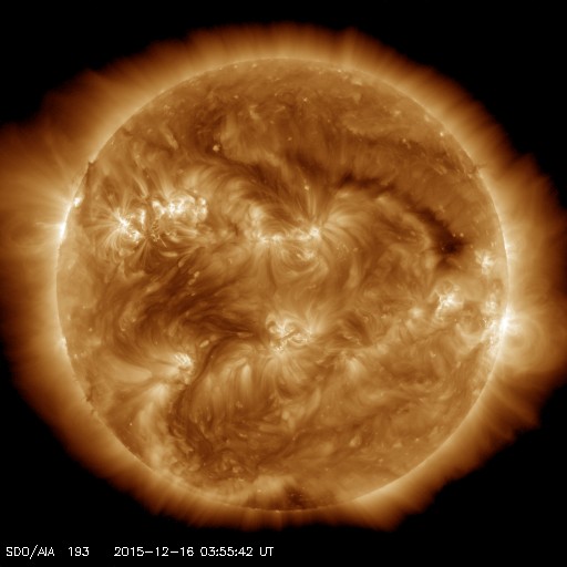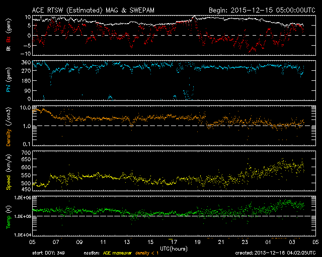 2015/12/16 13:02 更新 太陽風は600km/秒と高い速度に再び上昇しています。 担当 篠原 太陽風の速度は、昨日より今朝までは、 500〜550km/秒の高速風が続いていました。 しかし、今朝、16日8時(世界時15日23時)頃から再び速度が高まり、 現在は、600km/秒にまで高まっています。 27日周期の図で前周期の速度変化と比べると、 今回やって来た高速風の規模はだいぶ大きくなっているようです。 磁場の南北成分は、 北寄りになったり、南寄りになったりしています。 このため、磁気圏の活動は途切れ途切れに強まっています。 AE指数の変化は、500nT程度と規模はやや小さくなっています。 SDO衛星AIA193では、コロナホールは西に更に進んでいます。 影響は次第に弱まっていくでしょう。 太陽は、中央部南側の2468黒点群で、 C1.2の小さいフレアが発生した程度で、穏やかです。 2470黒点群は大きい姿を保っていますガ、 活動は特になく、穏やかに推移しています。 放射線帯の高エネルギー電子は、 大きく下がった後、少し回復していますが、 小さい値に留まっています。 ![]() 2470黒点群の拡大写真。SDO衛星。 (c) SDO (NASA)、作図:宇宙天気ニュース ![]() SDO衛星のAIA193カメラによる太陽コロナの様子 (c) SDO (NASA) ![]() SDO衛星による太陽の可視光写真。マウスの矢印を写真に重ねると、黒点番号付きの写真に切り替わります。 (c) SDO (NASA) ![]() ACEが観測した太陽風の磁場(1番上の枠、白線は全体の強度、赤線は南北成分) および、太陽風の密度(3番目の橙線)、速度(4番目の黄線) (c) NOAA/SWPC ![]() リアルタイムAE指数 下段のAEグラフの値が高くなると、オーロラ活動が活発化しています。 (c) 京都大学, NICT ![]() 27日の太陽周期に合わせたデータプロット 太陽が同じ面を地球に向けていた27日前の変化から、今後を予想することができます。 (c) 作図:宇宙天気ニュース