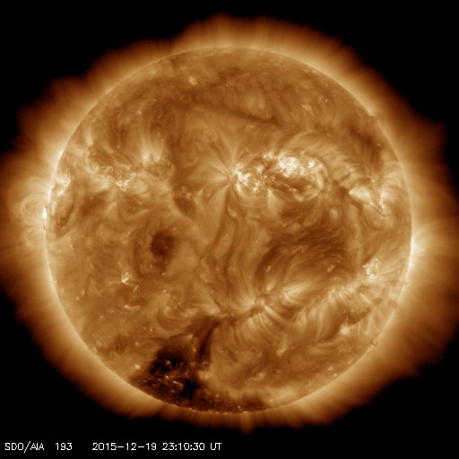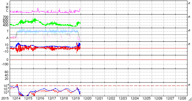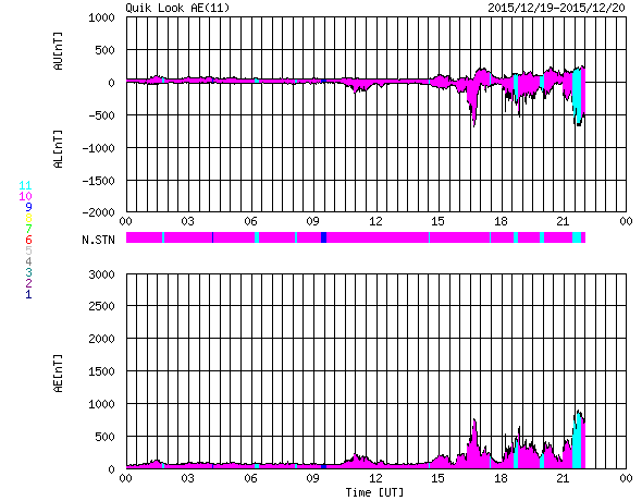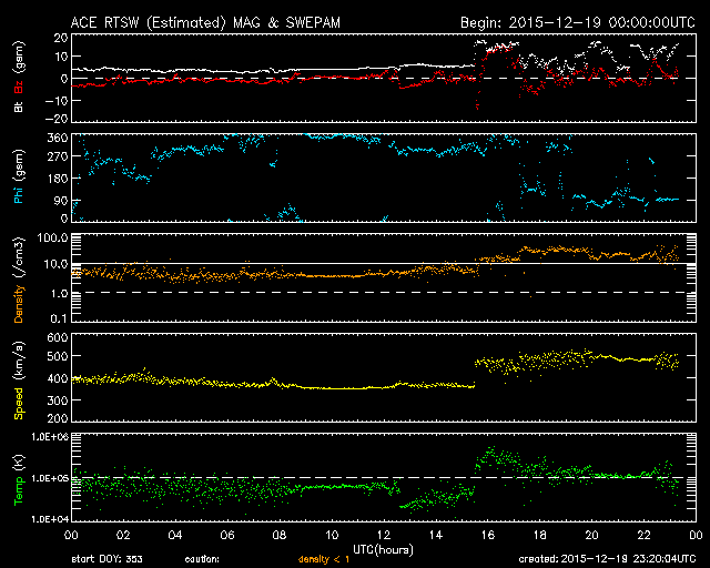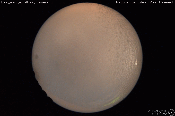 2015/12/20 08:21 更新 CMEによる太陽風の乱れが到来しました。磁気圏の活動もやや高まっています。 担当 篠原 16日に発生したCMEによる太陽風の乱れが、 20日0時半(世界時19日15時半)にACE衛星で観測されました。 太陽風の速度は、350km/秒から480km/秒に上がり、 磁場強度は、5nTから15nTに強まりました。 磁場の南北成分は、南に振れたり北に振れたりしていますが、 大きく振れたのは初めだけで、 以降は比較的小さい振れ幅になっています。 オーロラの活動度を示すAE指数は、 500〜800nTと中規模の変化が続いています。 世界時19日20時頃にノルウェー・スバールバル島で撮影された 全天カメラによるオーロラの動画を掲載します。 雲間からやっと見えたオーロラですが、赤い光が目立っています。 太陽風は、現在も480km/秒と高速の状態が続き、 磁場強度も5〜15nTと強まった状態で変化しています。 太陽風の強まりは、1〜2日程度かけて弱まっていくでしょう。 その後は、穏やかな太陽風がしばらく続きそうです。 太陽は、19日11時(世界時19日2時)に、 2468黒点群でC3.1の小規模フレアが発生し、 今朝、20日7時(世界時19日22時)には、 東端(左端)でC3.2のフレアも起きています。 この後、ここから活動的な領域が姿を現しそうです。 ![]() ノルウェー・スバールバル島のLongyearbyenで、世界時19日20時頃に撮影されたオーロラ。 (c) 国立極地研究所、(動画加工 : 宇宙天気ニュース) ![]() SDO衛星のAIA193カメラによる太陽コロナの様子 (c) SDO (NASA) ![]() SDO衛星による太陽の可視光写真。マウスの矢印を写真に重ねると、黒点番号付きの写真に切り替わります。 (c) SDO (NASA) ![]() ACEが観測した太陽風の磁場(1番上の枠、白線は全体の強度、赤線は南北成分) および、太陽風の密度(3番目の橙線)、速度(4番目の黄線) (c) NOAA/SWPC ![]() リアルタイムAE指数 下段のAEグラフの値が高くなると、オーロラ活動が活発化しています。 (c) 京都大学, NICT ![]() 27日の太陽周期に合わせたデータプロット 太陽が同じ面を地球に向けていた27日前の変化から、今後を予想することができます。 (c) 作図:宇宙天気ニュース