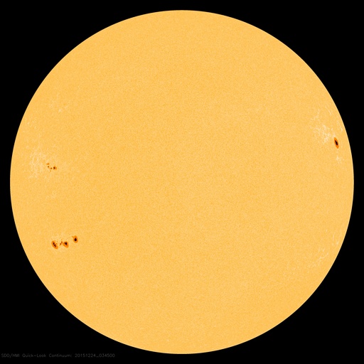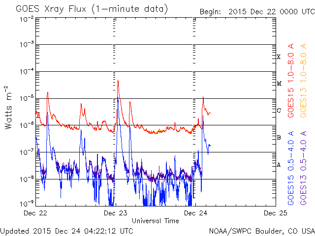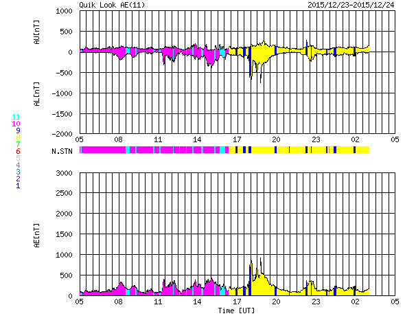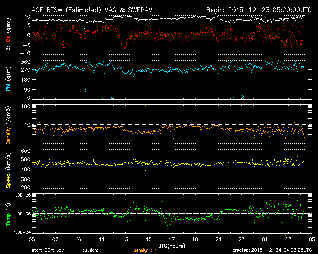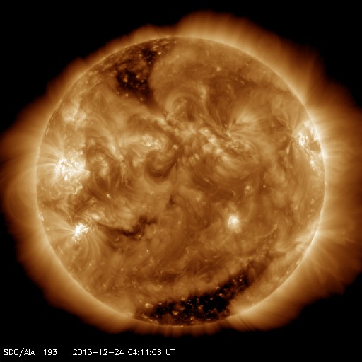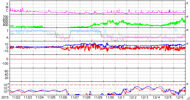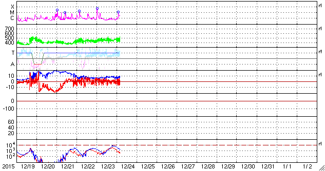 2015/12/24 13:23 更新 2473黒点群でM1.1の中規模フレアが発生しました。太陽風はやや高速です。 担当 篠原 昨日のニュースの直後、23日13時(世界時23日4時)に、 太陽の北東側の2472黒点群で、 C7.5とやや大きい小規模フレアが発生し、 太陽の南東(左下)の2473黒点群では、 今日、24日11時(世界時14日2時)に、 M1.1の中規模フレアが起きています。 目立ったフレアはこの2つ程度で、 フレアの発生頻度はやや下がっている様です。 一方、黒点の規模は保たれているようで、 引き続き活動の高まりに注目して下さい。 太陽風は、450km/秒とやや高速の状態が続いています。 磁場強度も、8nT前後にやや高まっています。 磁場の南北成分は、0nTを挟んで南北に小さく変化しています。 磁気圏では、小規模の活動が続いているようで、 AE指数は、300nT前後の変化が頻繁に起きています。 SDO衛星AIA193の太陽写真を見ると、 南半球側のコロナホールは、西に進み、 影響は次第に弱まりそうです。 一方、北半球の高緯度に広がるコロナホールが、 太陽の中心に近づいています。 こちらも緯度が高めですが、弱い影響がやってくるかもしれません。