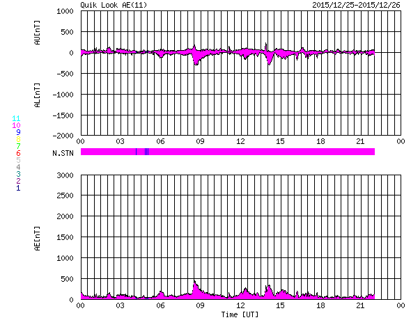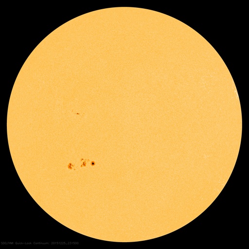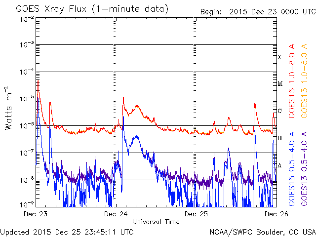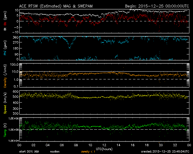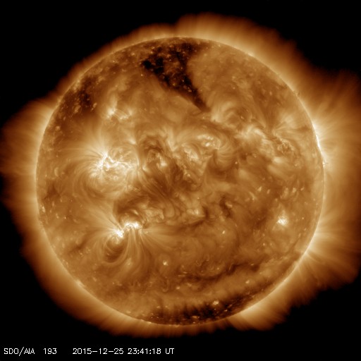 2015/12/26 09:10 更新 太陽でCクラスフレアが続いています。太陽風は高速です。 担当 篠原 太陽では、Cクラスのフレアの発生が続いています。 南側の2473黒点群では、C2.0、C1.0、C1.1、C3.0と、 昨日のニュース以降、小規模フレアが4回発生し、 北側の2472群では、26日2時(世界時25日17時)に、 C6.9とやや大きい小規模フレアが発生しています。 2つの黒点群は、太陽の中央に近づいて、 CMEを起こした場合は、地球へ影響が及びやすくなっています。 引き続き注目して下さい。 太陽風は、500km/秒と高速の状態が続いています。 昨日から今日にかけて、 磁場強度は、5nTから10nT近くへ高まる変化をしています。 高速風は、しばらく続くのかもしれません。 太陽風磁場の南北成分は、 やや北寄りに、0nT付近を変化しています。 磁気圏では、小規模の活動がある程度起きていて、 AE指数は小さい変化が頻繁に見られます。 SDO衛星AIA193では、 コロナホールは、北半球の高緯度にはあるものの、 低緯度域にはありません。 太陽風は次第に穏やかになりそうですが、 現在の高速風は、これからどう変化するでしょうか。 ![]() SDO衛星のAIA193カメラによる太陽コロナの様子 (c) SDO (NASA) ![]() SDO衛星による太陽の可視光写真。マウスの矢印を写真に重ねると、黒点番号付きの写真に切り替わります。 (c) SDO (NASA) ![]() GOES衛星の太陽X線データ (c) NOAA/SWPC ![]() ACEが観測した太陽風の磁場(1番上の枠、白線は全体の強度、赤線は南北成分) および、太陽風の密度(3番目の橙線)、速度(4番目の黄線) (c) NOAA/SWPC ![]() リアルタイムAE指数 下段のAEグラフの値が高くなると、オーロラ活動が活発化しています。 (c) 京都大学, NICT ![]() | ||||||||||||||||||||||||||||||||||||||||||||||||||||||||