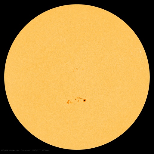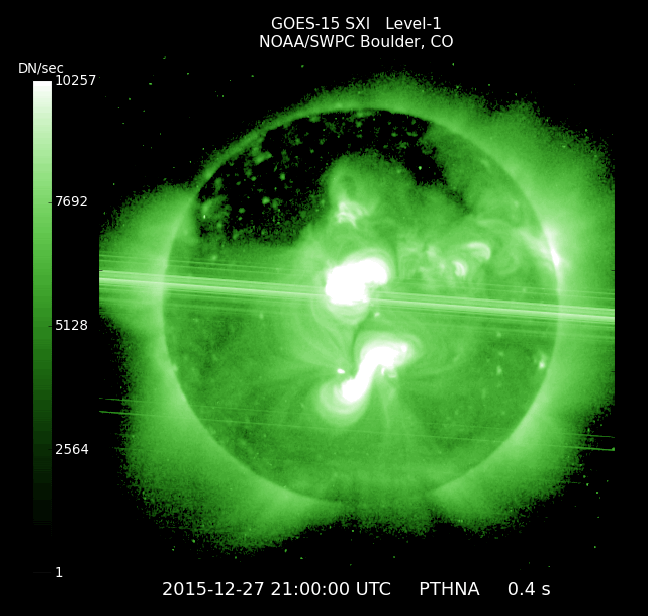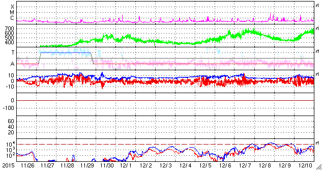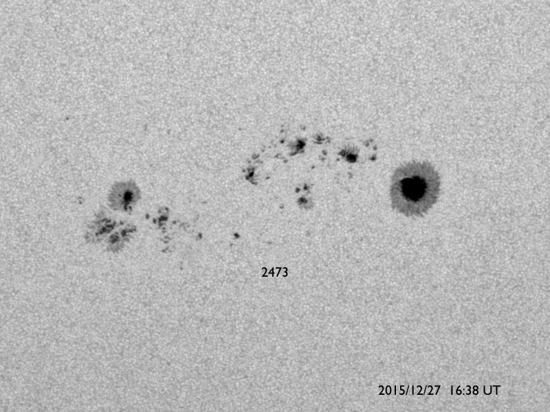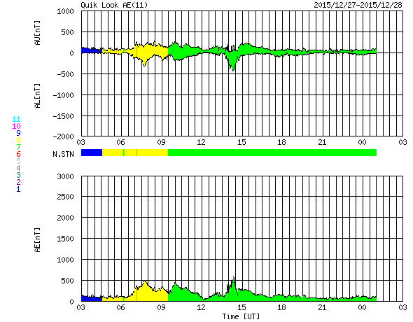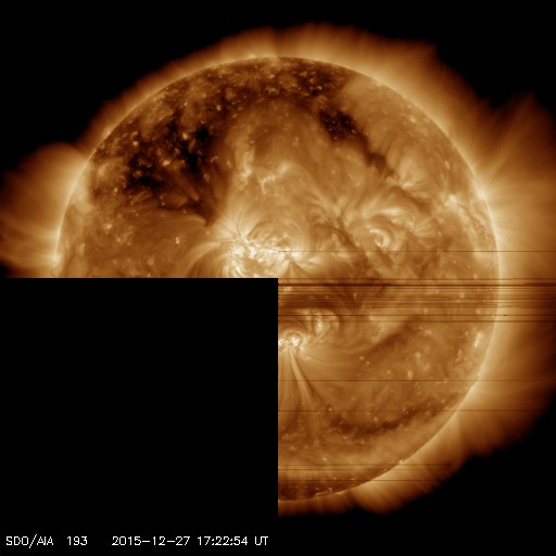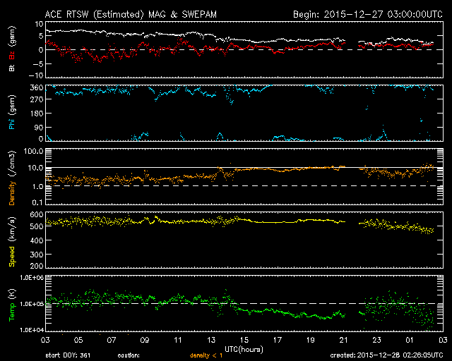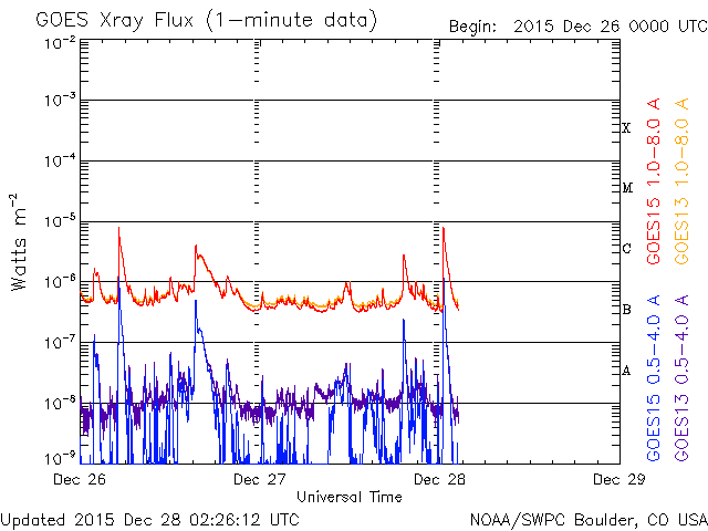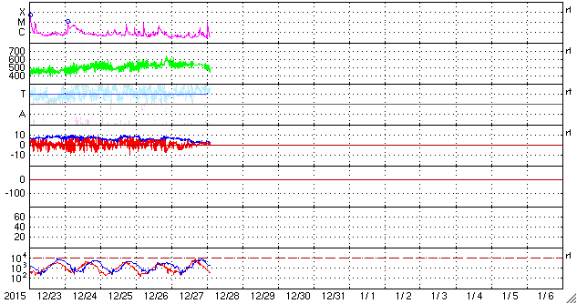 2015/12/28 11:28 更新 2473群でC8.0の小規模フレアが発生しました。高速太陽風は終わりつつあります。 担当 篠原 太陽は、南側の2473黒点群だけが目立つようになっています。 ここで、今朝、28日9時半(世界時28日0時半)に、 C8.0の小規模フレアが発生しました。 SDO衛星は、今日のAIA193の写真が一部欠けているように、 降雪のためデータ受信に障害が発生しているそうです。 黒点の写真も、半日ほど前のものです。 現在、天候の回復を待っているとのことです。 このため、久しぶりにGOES衛星のX線カメラの動画で、 フレアの様子を紹介します。 X線のグラフでは、 特に活動が活発化している様子はありませんが、 引き続き注目して下さい。 太陽風の速度は、 550km/秒に高まった状態が今朝まで継続しました。 磁場強度は、7nTから、今日に入る頃に3nTへ下がり、 弱い高まりは終わっています。 速度も、この後470km/秒へ下がる変化が見られています。 今回の太陽風の高まりは、終わりに向かっているようです。 一方、SDO衛星AIA193の写真では、 北東側(左上)から、次のコロナホールが近付いています。 3〜4日後くらいからは、こちらの影響が始まりそうです。 AE指数は、前半に小規模の変化が見られましたが、 太陽風磁場が北寄りになった後半からは静かになっています。 太陽風の高まりも終わりつつあるので、 磁気圏もしばらく穏やかに推移しそうです。