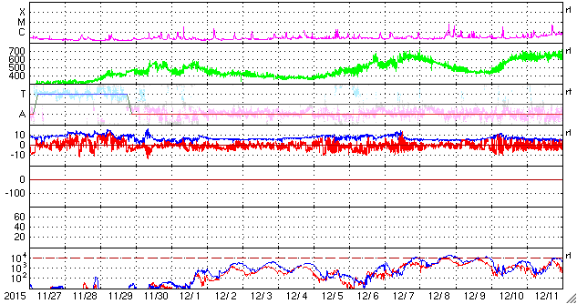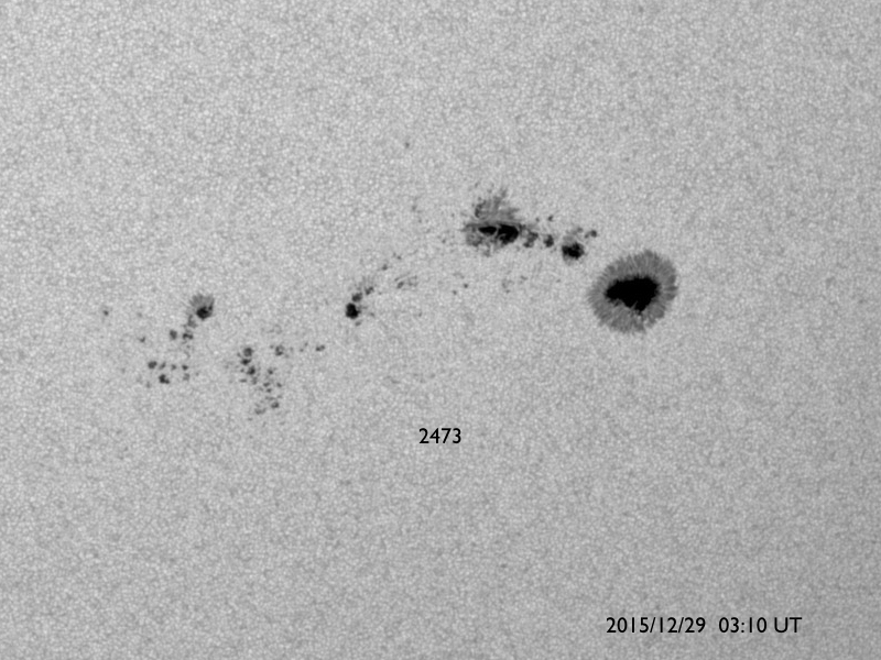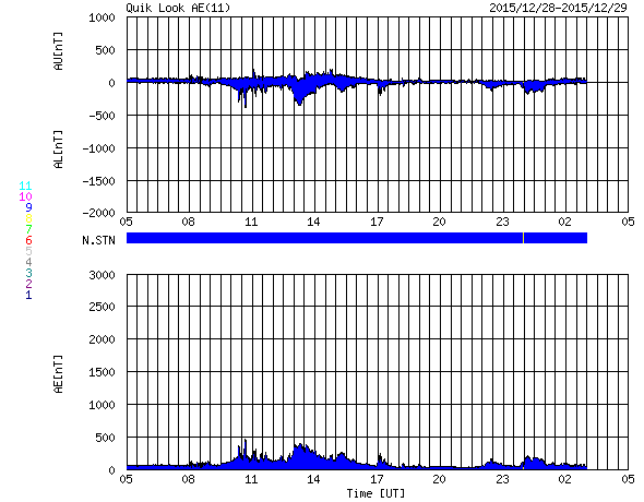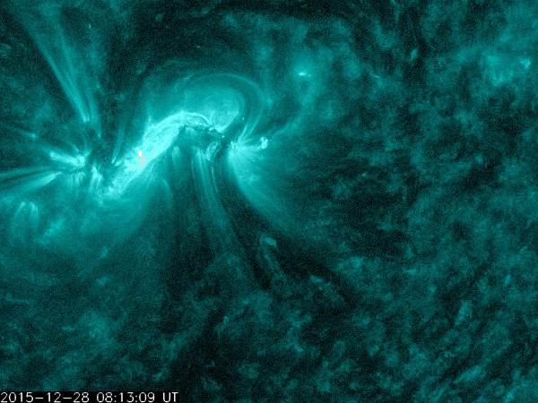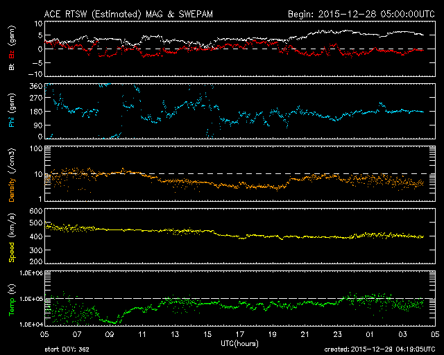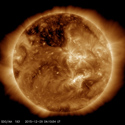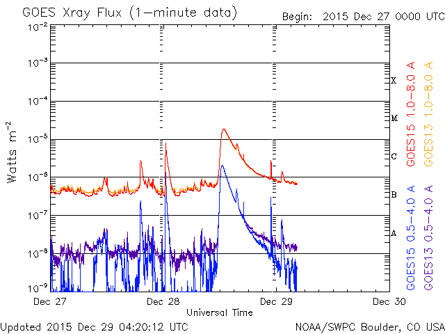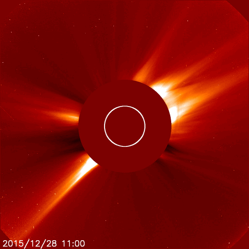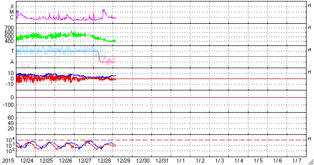 2015/12/29 13:21 更新 M1.8の中規模フレアが発生し、CMEの乱れが地球方向にも向かっています。 担当 篠原 昨夜、28日20時半(世界時28日11時半)に、 2473黒点群でM1.8の中規模フレアが発生しました。 X線の強度が長い時間増加する型のフレアで、 CME(太陽ガスの放出現象)も発生しています。 SDO衛星AIA131とAIA304による、フレアの動画を掲載します。 AIA304(赤い写真)では、 右に向かってコロナのガスが噴き上がる様子も見えています。 2枚目は、SOHO衛星LASCO C2、C3によるCMEの様子です。 右下側を中心にしているようですが、 太陽全体を包む様にガスは広がっていて、 太陽風の乱れは地球にも向かっていると考えられます。 到来まで2〜3日程度と考えると、 明日の夜から明後日にかけて、地球に到来するのではないかと思われます。 NOAA/SWPCの太陽風予測では、 30日19時(世界時30日10時)頃の到来を予想しています。 到来が早いほど、太陽風の速度の上昇も大きくなります。 また、磁場強度が高まって、大きく南向きに振れると、 磁気圏の活動も激しくなります。 明日以降、太陽風の変化と磁気圏活動の高まりに注意して下さい。 2015年の最後に、オーロラの激しい変化が見られるかもしれません。 2473黒点群では、その後も、C7.5、C4.1、C2.8などの 小規模フレアが起きています。 まだ太陽の中心近くにあるので、引き続き注目して下さい。 太陽風は、速度が450km/秒から400km/秒に下がり、 平均的な速度に戻っています。 磁場強度は、3nTから5nTに上がり、こちらも平均的な強さです。 磁場の南北成分は、0nTを挟んで小さく南北に変化しています。 磁気圏では小さい活動が起きていて、 AE指数は、200〜300nTの変化が度々発生しています。 SDO衛星AIA193のコロナの写真では、 北半球の中高緯度域のコロナホールが、 ちょうど太陽の中央線に達しています。 このため、3日後の1月1日あたりから、 太陽風の強まりが始まるかもしれません。 新年最初のオーロラ活動の高まりは、 このコロナホールがもたらすかもしれません。