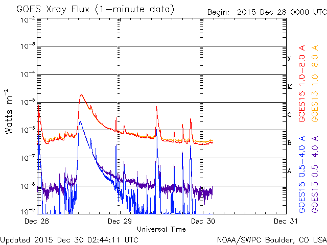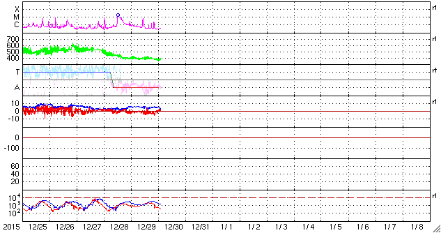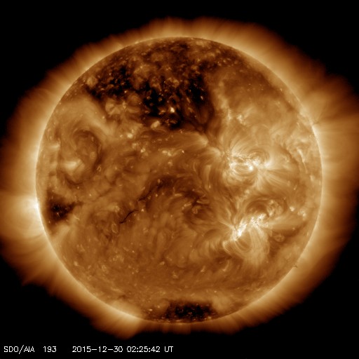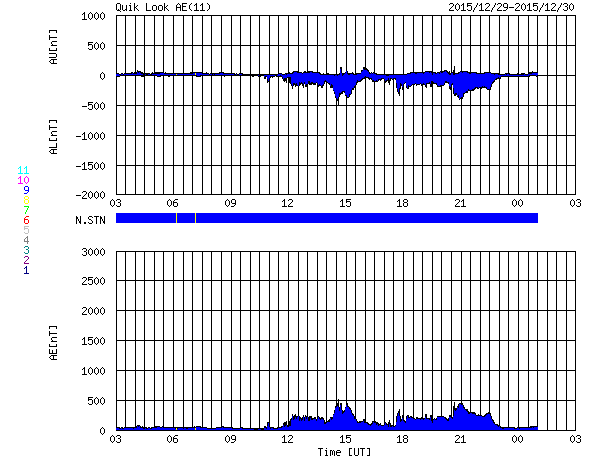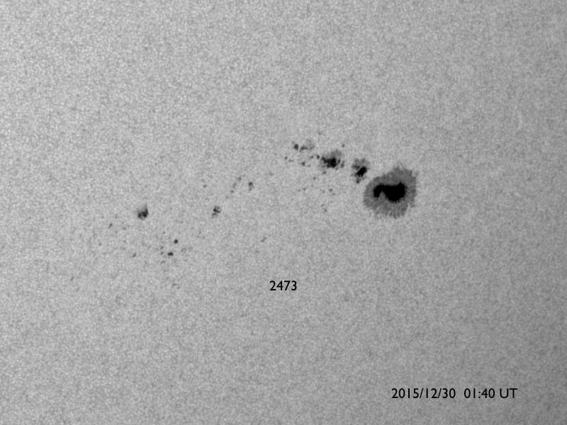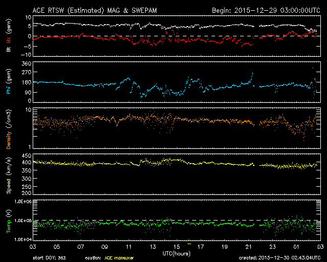 2015/12/30 11:45 更新 太陽風はやや低速です。CMEによる太陽風の乱れが近づいています。 担当 篠原 2473黒点群では、昨夜、29日19時(世界時29日10時)に、 C6.8の小規模フレアが発生し、 その後、今日に入って、C1.5、C2.5のフレアを起こしています。 活動は続いていますが、拡大写真を昨日と比べると、 黒点は小さくなっているようで、 全体としては弱まる傾向にあるようです。 太陽風は、速度が380km/秒に下がり、 やや低速になりつつあります。 磁場強度は、5nTと平均的な状態です。 磁場の南北成分は、グラフの後半で弱い南向きになっていて、 これに対応して、AE指数のグラフも、 後半に200〜400nTの小規模の変化が発生しています。 ある程度オーロラの活動が見られたようです。 昨日のニュースでお知らせしたように、 M1.8のフレアに伴って発生したCMEによる 太陽風の乱れが近づいています。 今夜から明日には地球に達すると考えられます。 今後のACE衛星のデータに注目して下さい。 磁場が強まって、南向きに大きく変化すると、 オーロラの活動も一気に活発化するでしょう。 2015年の最後を飾るイベントになりそうです。 一方、SDO衛星AIA193の太陽写真の北半球のコロナホールが、 太陽の中心線上に見えています。 緯度がやや高めですが、ここから流れ出している高速の太陽風が、 3日後くらいに地球に来ているかもしれません。 新年を飾るオーロラの高まりにも期待したいところです。 ![]() 2473黒点群の拡大写真。SDO衛星。 (c) SDO (NASA)、作図:宇宙天気ニュース ![]() SDO衛星のAIA193カメラによる太陽コロナの様子 (c) SDO (NASA) ![]() SDO衛星による太陽の可視光写真。マウスの矢印を写真に重ねると、黒点番号付きの写真に切り替わります。 (c) SDO (NASA) ![]() GOES衛星の太陽X線データ (c) NOAA/SWPC ![]() ACEが観測した太陽風の磁場(1番上の枠、白線は全体の強度、赤線は南北成分) および、太陽風の密度(3番目の橙線)、速度(4番目の黄線) (c) NOAA/SWPC ![]() リアルタイムAE指数 下段のAEグラフの値が高くなると、オーロラ活動が活発化しています。 (c) 京都大学, NICT ![]() 27日の太陽周期に合わせたデータプロット 太陽が同じ面を地球に向けていた27日前の変化から、今後を予想することができます。 (c) 作図:宇宙天気ニュース
