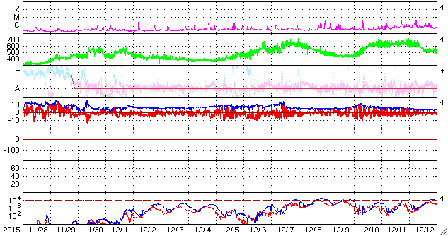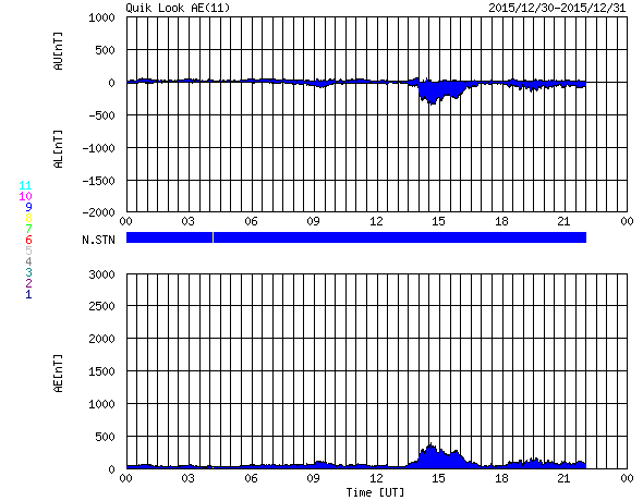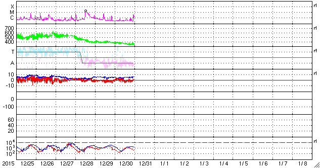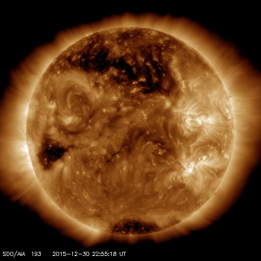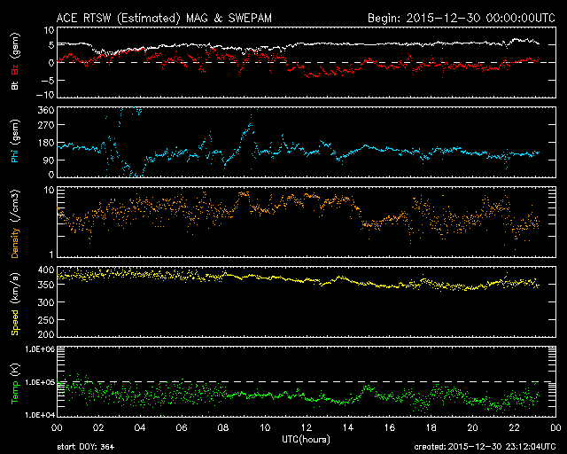 2015/12/31 08:14 更新 太陽風は低速になっています。CMEによる乱れはまだ到来していません。 担当 篠原 太陽風の速度は350km/秒へ下がり、低速の風になっています。 磁場強度は、5nTと平均的な値で安定しています。 CMEによる太陽風の乱れはまだ到来していません。 フレアが発生して2日半が経過して、そろそろ来ても良い頃です。 今夜にかけて注目して下さい。 このタイミングだと、年をまたぐ擾乱になりそうです。 太陽風磁場の南北成分は、小さい変化に留まり、 グラフの前半は北寄り、後半は南寄りになっています。 このため、AE指数のグラフは、後半に小さい変化が起きている程度で、 磁気圏は概ね静穏です。 SDO衛星AIA193では、北半球高緯度側のコロナホールが、 太陽の西に進んでいます。 こちらからの影響も近づいている可能性があり、 二つの太陽風の乱れが、重なるようにやって来るかもしれません。 太陽では、先ほど、31日7時半(世界時30日22時半)に、 2473黒点群で、C4.3の小規模フレアが発生しました。 2473群は、昨日よりも黒点が小さくなっていて、 弱まる傾向は続いています。 太陽は、東端から新しい黒点の出現もなく、 次第に寂しい見え方になっています。 ![]() SDO衛星のAIA193カメラによる太陽コロナの様子 (c) SDO (NASA) ![]() SDO衛星による太陽の可視光写真。マウスの矢印を写真に重ねると、黒点番号付きの写真に切り替わります。 (c) SDO (NASA) ![]() ACEが観測した太陽風の磁場(1番上の枠、白線は全体の強度、赤線は南北成分) および、太陽風の密度(3番目の橙線)、速度(4番目の黄線) (c) NOAA/SWPC ![]() リアルタイムAE指数 下段のAEグラフの値が高くなると、オーロラ活動が活発化しています。 (c) 京都大学, NICT ![]() 27日の太陽周期に合わせたデータプロット 太陽が同じ面を地球に向けていた27日前の変化から、今後を予想することができます。 (c) 作図:宇宙天気ニュース