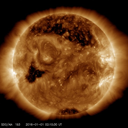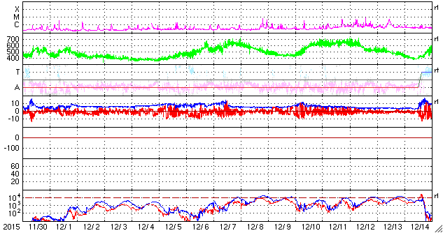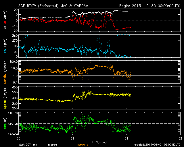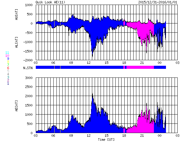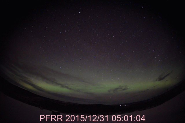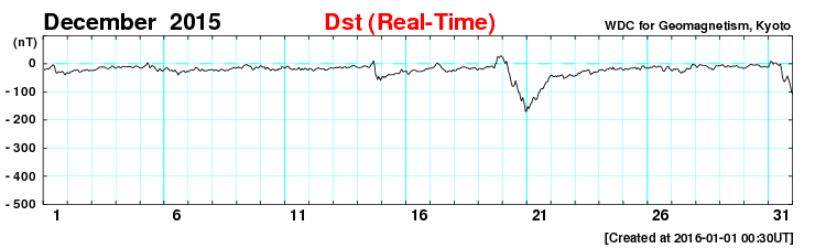 2016/ 1/ 1 11:19 更新 CMEによる太陽風の乱れが到来し、磁気圏の活動を強めています。 担当 篠原 明けましておめでとうございます。 2016年も宇宙天気ニュースをよろしくお願い致します。 昨日のニュースの直後、 31日9時(世界時31日0時)に、 CMEによる太陽風の乱れが地球に到来しました。 発生からおよそ2日半かかっての到来です。 太陽風の速度は、350km/秒から430km/秒に上がり、 やがて、480km/秒ほどに達した程度で、 やや高速の風になったくらいでした。 磁場強度は、5nTから10〜15nTに強まりました。 太陽風磁場の南北成分は、 初めは0nTを挟んで、南北に小さく変化する程度でした。 速度があまり高まらなかったこともあり、磁気圏への影響は小さく、 AE指数の変化も、当初は高まりませんでした。 状況が変わってきたのは、31日の夜に入ってからです。 31日19時(世界時31日10時)くらいから、 太陽風の磁場が南向きに大きく変化するようになり、 -15nT前後の強い南向きが長い時間続くようになりました。 この結果、AE指数の変化は急増して、1000nTに達するようになり、 最大で2000nTに達する変化も記録しています。 アラスカ・フェアバンクスのオーロラを紹介します。 世界時8時頃からオーロラの輝き方が一段と強まっています。 本当に激しくなる12時近くになると、 残念なことに曇ってしまいましたが、 雲の上でオーロラが激しく活動している様子がうかがえます。 太陽風は、現在も強まった状態が続いていて、 速度は450km/秒とやや高速程度ですが、 磁場強度は15nTに高まっていて、 南北成分も-10nTを少し超えて強く南を向いています。 AE指数も1000nT前後の激しい変化が続いています。 極域では素晴らしい新年の夜を迎えているようです。 また、Dst指数(速報値)は、グラフが月をまたいでしまいましたが、 現在、-129nTまで強まっています。 中規模から大規模くらいの磁気嵐になっているようです。 太陽は、2473黒点群で、 C1.4、C1.6と小さいフレアが発生していますが、 全体としては穏やかです。 にぎやかな1年の始まりになりました。