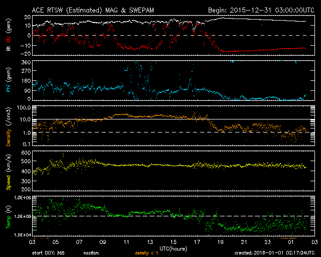 (c) NOAA/SWPC ![]() アラスカ、フェアバンクス近くのPoker Flatで撮影されたオーロラの様子。 (c) 情報通信研究機構、(動画加工 : 宇宙天気ニュース) ![]() Dst指数(速報値)は、12月の最後に-109nTへ下がり、1月に入って、更に-129nTまで下がっています。Dst指数はマイナス方向に強まります。 (c) 京都大学WDC ![]() SDO衛星のAIA193カメラによる太陽コロナの様子 (c) SDO (NASA) ![]() SDO衛星による太陽の可視光写真。マウスの矢印を写真に重ねると、黒点番号付きの写真に切り替わります。 (c) SDO (NASA) ![]() ACEが観測した太陽風の磁場(1番上の枠、白線は全体の強度、赤線は南北成分) および、太陽風の密度(3番目の橙線)、速度(4番目の黄線) (c) NOAA/SWPC ![]() リアルタイムAE指数 下段のAEグラフの値が高くなると、オーロラ活動が活発化しています。 (c) 京都大学, NICT ![]() 27日の太陽周期に合わせたデータプロット 太陽が同じ面を地球に向けていた27日前の変化から、今後を予想することができます。 (c) 作図:宇宙天気ニュース