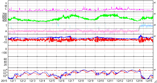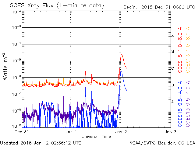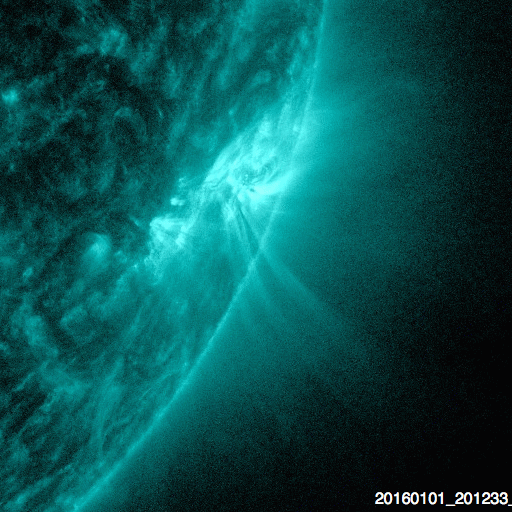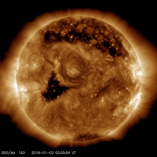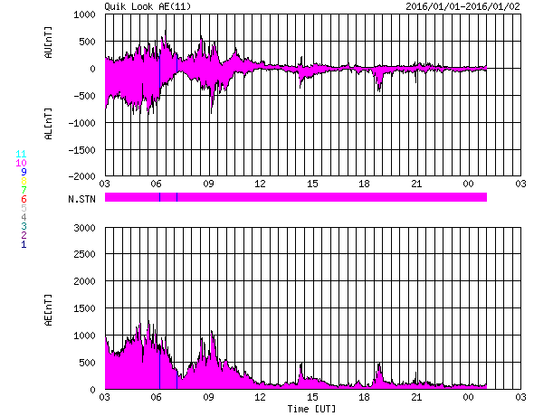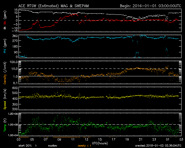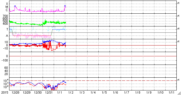 2016/ 1/ 2 11:38 更新 太陽風の乱れは終わり、磁気圏も穏やかになっています。M2.4の中規模フレアが発生しました。 担当 篠原 太陽風の速度は、430km/秒と平均的な状態で安定しています。 10nTを超えて強まっていた磁場強度は、 今朝にかけて弱まり続け、 一時的に5nTを割るほどに下がりましたが、 その後、高まる変化が到来して、現在は10nTに再び高まっています。 CMEによる太陽風の乱れは終わりましたが、 続いて、コロナホールによる太陽風の高まりが 始まろうとしているのかもしれません。 しばらくACE衛星のデータに注目して下さい。 太陽風磁場の南北成分は、昨夜までは南向きに強まっていましたが、 その後は、0nT付近に留まるようになっています。 このため、磁気圏の活発な活動も終わっています。 AE指数のグラフは、 初めの頃に1000nt前後の大きな変化が記録されていますが、 中盤以降は変化がなくなり、磁気圏は静穏になっています。 最後のオーロラの高まりの様子を、 アラスカ・フェアバンクスの動画で紹介します。 Dat指数(速報値)は、最大で -114nTの変化になっています。 昨日より変化が小さくなっているのは、 最新の観測データを基に、指数を随時更新しているためです。 SDO衛星AIA193の太陽写真では、 北半球高緯度域のコロナホールは更に西に進み、 この領域の影響がやって来るなら、そろそろだと思います。 一方、赤道域には、太陽の中心線に達しようとしている 次のコロナホールが見えています。 4日後の6日あたりからは、こちらの影響が地球に到来するでしょう。 27日周期の図の前周期の変化を見ると、 12月10〜13日にかけて、太陽風速度の高まりが到来しています。 この変化の回帰です。 今朝、2日8時(世界時1日23時)に、太陽の南西(右下)の2473黒点群で、 M2.4の中規模フレアが発生しました。 2016年第一号のMクラスフレアです。 SDO衛星AIA131による動画を掲載します。 このフレアに伴ってCMEも発生している可能性がありますが、 まだ、SOHO衛星の写真は更新されていません。 西の端近くで発生しているので、地球への影響はなさそうです。 2473黒点群は、もうすぐ没して見えなくなりますすが、 東端から、2476群、2477群と、2つの黒点群が現れました。