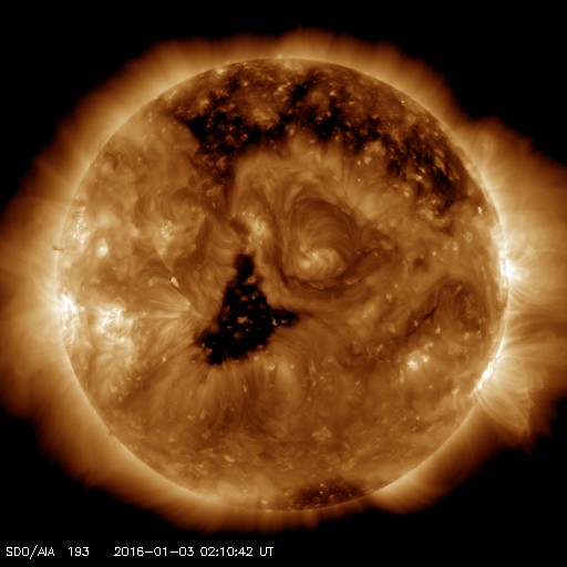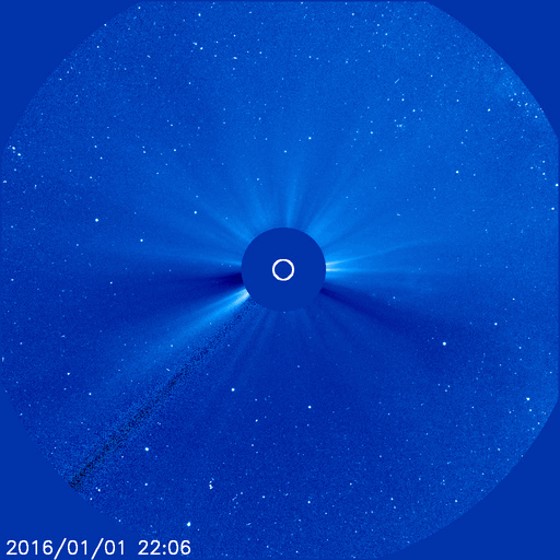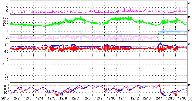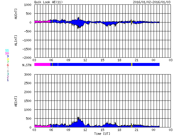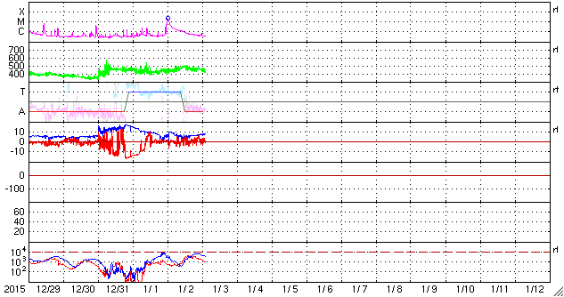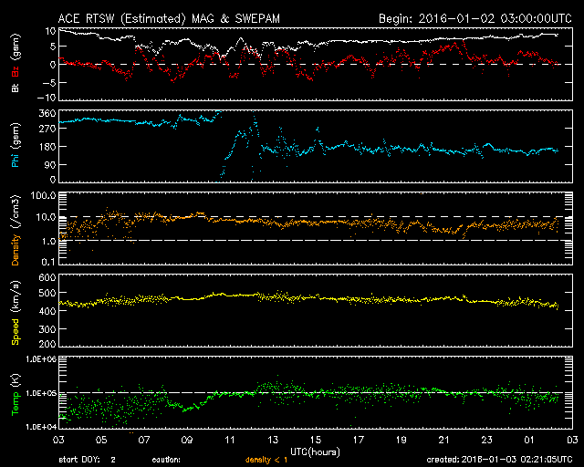 2016/ 1/ 3 11:23 更新 太陽風はやや高まっています。太陽は穏やかです。ニュージーランドのオーロラをどうぞ。 担当 篠原 ニュージーランド南島ダニーデンの中村太一さんより、 2016年最初のオーロラの写真をいただきました。 ニュージーランドでは、 まだ年末の時間にはオーロラの気配はないままで、 年越しの花火があちこちで打ち上がった後、 月の出とともにオーロラの出現が始まり、 朝焼けに消されていくまで輝き続けたそうです。 1枚目は、現地1日00:54(世界時31日12:54)の撮影で、 写真中の光跡は、通りがかりのISS(国際宇宙ステーション)だそうです。 低緯度の鹿児島(北緯32度)に住んでいると、 深夜にISSが見えることはないのですが、 ダニーデンは南緯46度にあり、現地の夏至(日本では冬至)に近い現在は、 深夜でも上空には太陽の光が当たっているようです。 2枚目は、現地1日01:06(世界時31日13:06)の撮影。 この2枚は、月の出現とともに現れたオーロラの写真です。 そして、3枚目は、現地1日04:14(世界時31日16:14)、 4枚目は、現地1日04:23(世界時31日16:23)の撮影。 朝日が近づいて、消え始めながらも力強く輝き続けたオーロラです。 明日も、中村さんからいただいた新年初オーロラの写真を紹介します。 どうぞお楽しみに。 太陽風は、昨夜にかけて480km/秒程度に速度が高まりました。 その後はゆっくりと低下して、現在は430km/秒です。 全体としてやや高めの状態が続いていました。 磁場強度は、速度と反対に10nTから5nTに下がり、 現在は再び8nTに高まっています。 しばらく現状のような太陽風が続くのかもしれません。 磁気圏は概ね静穏で、 AE指数は500nTの変化がひとつあるだけで、 その他はほとんど変化がありません。 SDO衛星AIA193の写真では、 赤道域のコロナホールが太陽の中心線に達しています。 ここから地球に向かって速度の高い太陽風が流れ出し、 3日ほどかけて地球にやって来ます。 1月6日頃から高速の太陽風が始まりそうです。 太陽は、フレアの発生はなく、穏やかです。 昨日発生したM2.3のフレアに伴って、 CME(太陽ガスの放出現象)が発生しています。 SOHO衛星LASCO C3の動画を見ると、 太陽から右に向かってガスが噴出しています。 地球への影響はなさそうです。