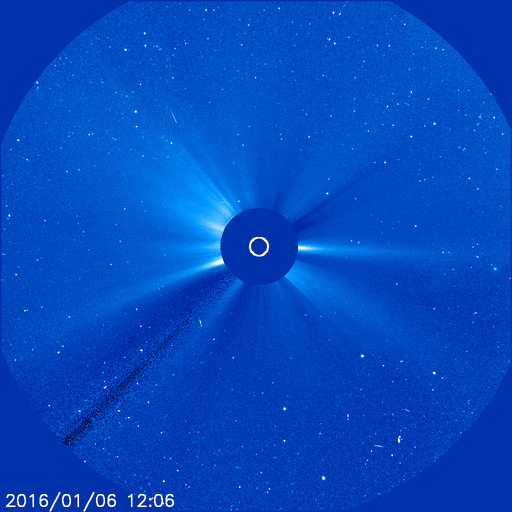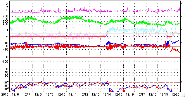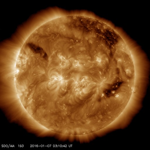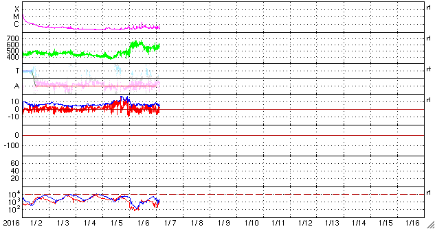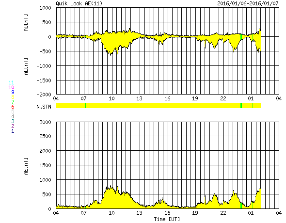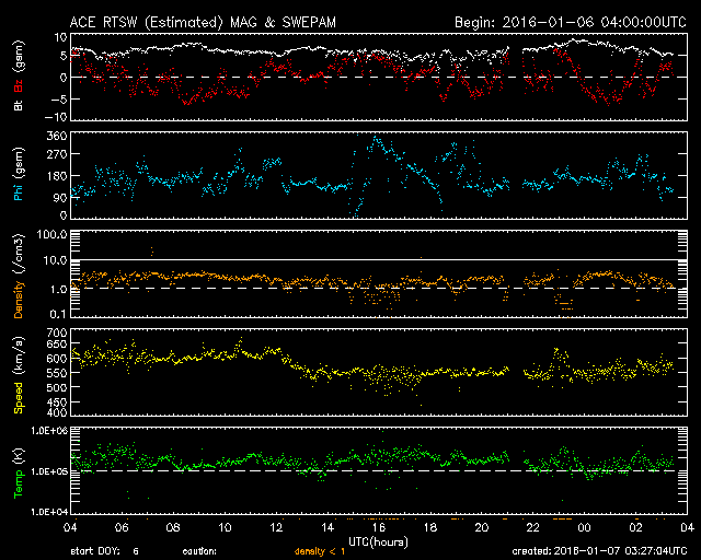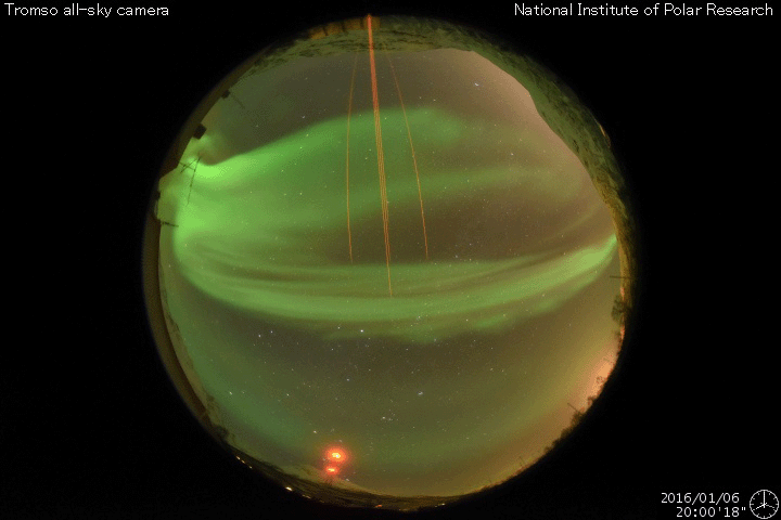 2016/ 1/ 7 12:28 更新 高速の太陽風が続き、磁気圏の活動も高まっています。 担当 篠原 高速の太陽風が続いています。 太陽風の速度は、昨夜、6日21時(世界時6日12時)頃までは、 600km/秒の状態が続き、 その後、550km/秒へ一段下がりましたが、 現在もそのまま高い速度を保っています。 磁場強度は、5〜7nTと少し強めの状態が続いています。 南北成分は、北を向いたり、南を向いたり、 ゆっくりと変化するようになっています。 このため、磁気圏でも、 活動が高まったり、静かになったりしています。 AE指数は、高まると、500〜700nTの中規模の変化が発生しています。 昨日に続いて、ノルウェー・トロムソの全天カメラの動画を掲載します。 AE指数のグラフの、世界時21時に見られる活動の高まりの様子です。 SDO衛星AIA193では、コロナホールは西に進み、 地球への影響は次第に弱まるでしょう。 磁場強度が5nTを割って下がると、高速風も後半に入ります。 太陽は、東端から新しい黒点が現れ、 2480群と番号が付けられています。 小さいフレアを頻繁に起こしているようで、 そのひとつは、C1.8とCクラスに達しています。 今後の活動に注目して下さい。 SOHO衛星では、CME(太陽ガスの放出現象)が観測されています。 右へ噴き出しているCMEは、 太陽の向こう側で発生した現象だと思われます。 噴出は見事ですが、地球への影響はありません。 一方、左へ向かっているCMEについては、 SDO衛星AIA193の動画を見ると、 3か所でフィラメント噴出のような現象が起きています。 一番目立っている現象は、太陽の端に近く、 地球への影響はなさそうですが、 その他の現象については、弱い影響がやって来るかもしれません。 規模は小さいですが、3日後の10日頃でしょうか。