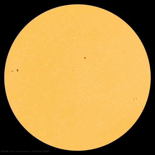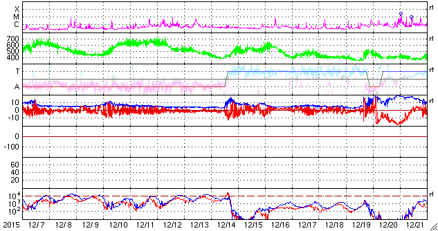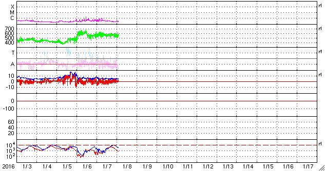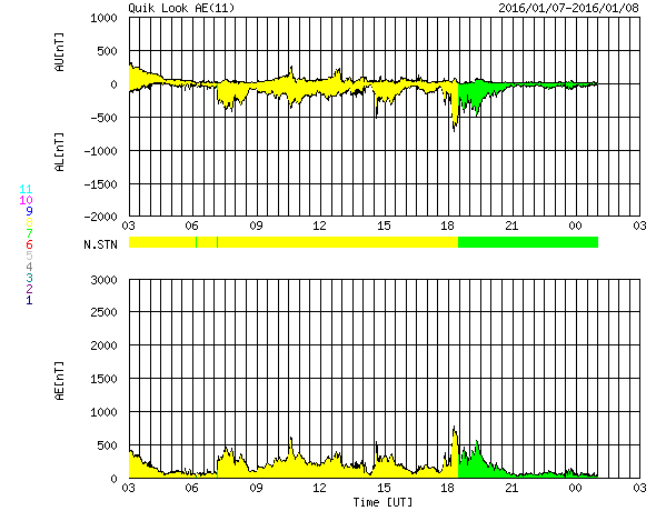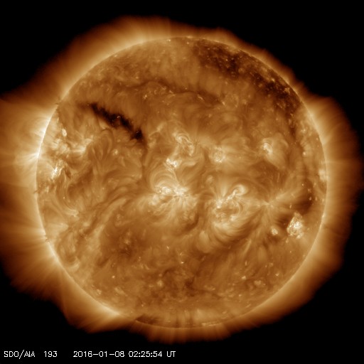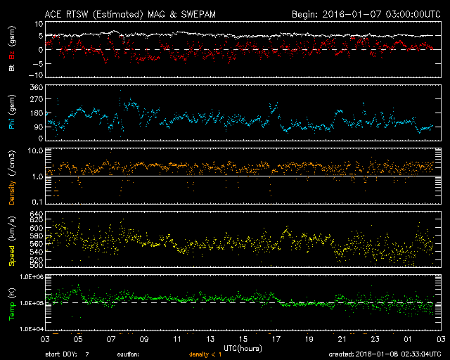 2016/ 1/ 8 11:32 更新 500km/秒台中盤の高速太陽風が続いています。磁気圏もやや活動的です。 担当 篠原 太陽風の速度は、 昨日のニュースの後、580km/秒へ少し上がり、 以降、ゆっくりと下がりながら、現在も540km/秒と、 高速の状態を保っています。 磁場強度は、5nTで安定した状態が続いています。 磁場の南北成分は、0nT付近で小さく南北に変化しています。 このため、磁気圏では小規模の活動が連続的に発生しているようで、 AE指数のグラフでは、500nTに達する程度の変化が、 頻繁に起きています。 27日周期の図では、前周期は12月13日まで高速風が続いています。 これを参考にすると、 明後日、10日には太陽風の速度は下がっているかもしれません。 また、前周期は12月14日に次の太陽風の高まりが始まっています。 この変化をもたらしていたコロナホールは、 今回は形がだいぶ変わっていて、 今日の写真では、太陽の北東側(左上)に細長く見えている程度です。 このため、太陽風への影響も、今回は変化が弱まって、 到来のタイミングも遅くなるかもしれません。 10日以降の太陽風の様子にも注目して下さい。 太陽は、昨日現れた2480黒点群の活動が一段落付いたのか, X線グラフの変化が見られなくなっています。 一方、可視光写真では、新しい黒点が2か所に現れています。 フレアを起こすほどに活動が高まるでしょうか。