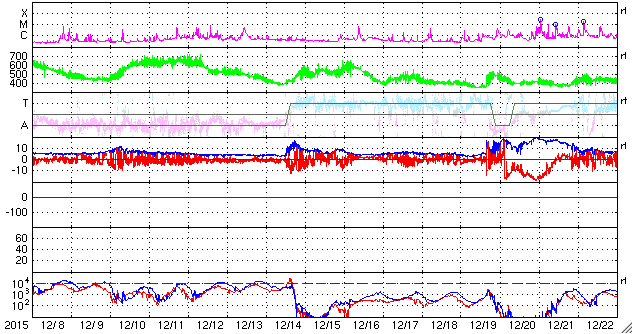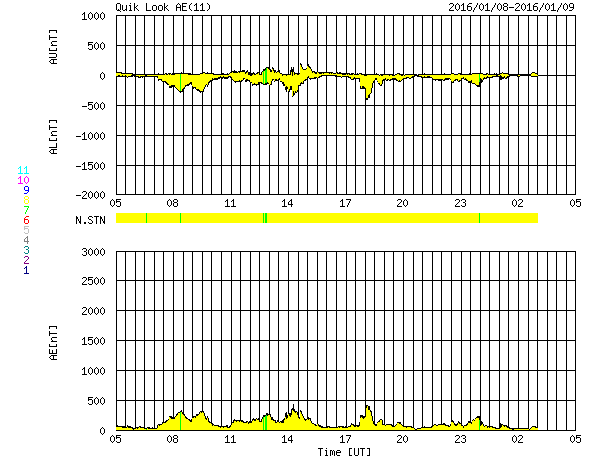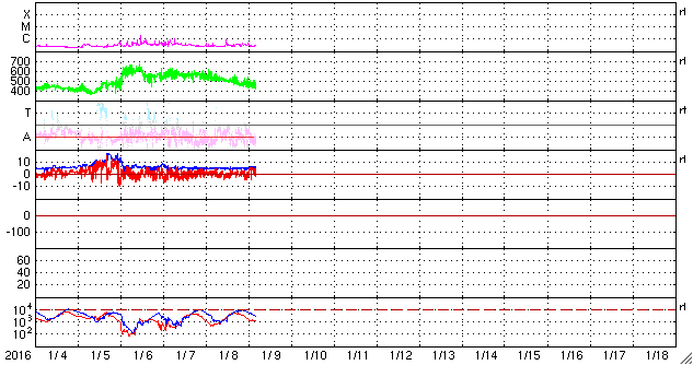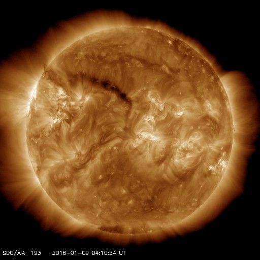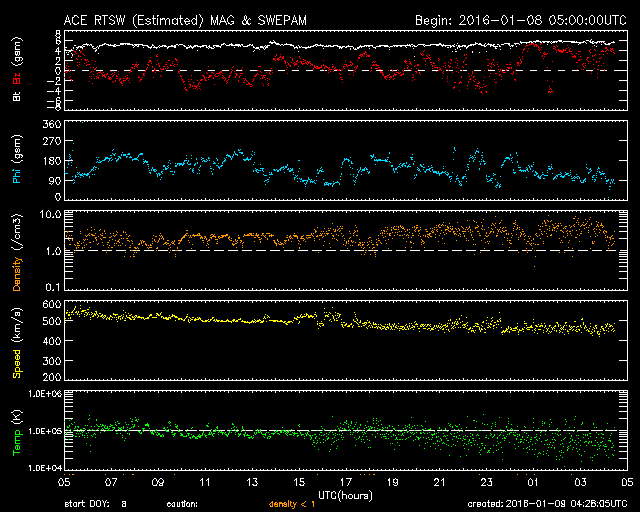 2016/ 1/ 9 13:29 更新 高速太陽風は終わりつつあります。太陽は穏やかな状態が続いています。 担当 篠原 昨日は550km/秒と高速だった太陽風の速度は、 その後ゆっくりと下がり続け、現在は450km/秒と、 高速風は終わりつつあります。 太陽風の磁場強度は、5nTで安定しています。 南北成分は、0nTをはさんで南北に小さく変化していて、 AE指数は300nT程度の中規模の変化が、 繰り返して発生しています。 太陽風が弱まってきたため、 磁気圏の活動も次第に小さくなっています。 今日いっぱいくらいで、太陽風は平均的な状態に戻り、 磁気圏もより穏やかになりそうです。 太陽は、小さいですが、黒点が増えていて、 群番号がにぎやかになっています。 しかし、フレアの発生は特になく、穏やかです。 ![]() SDO衛星のAIA193カメラによる太陽コロナの様子 (c) SDO (NASA) ![]() SDO衛星による太陽の可視光写真。マウスの矢印を写真に重ねると、黒点番号付きの写真に切り替わります。 (c) SDO (NASA) ![]() ACEが観測した太陽風の磁場(1番上の枠、白線は全体の強度、赤線は南北成分) および、太陽風の密度(3番目の橙線)、速度(4番目の黄線) (c) NOAA/SWPC ![]() リアルタイムAE指数 下段のAEグラフの値が高くなると、オーロラ活動が活発化しています。 (c) 京都大学, NICT ![]() 27日の太陽周期に合わせたデータプロット 太陽が同じ面を地球に向けていた27日前の変化から、今後を予想することができます。 (c) 作図:宇宙天気ニュース